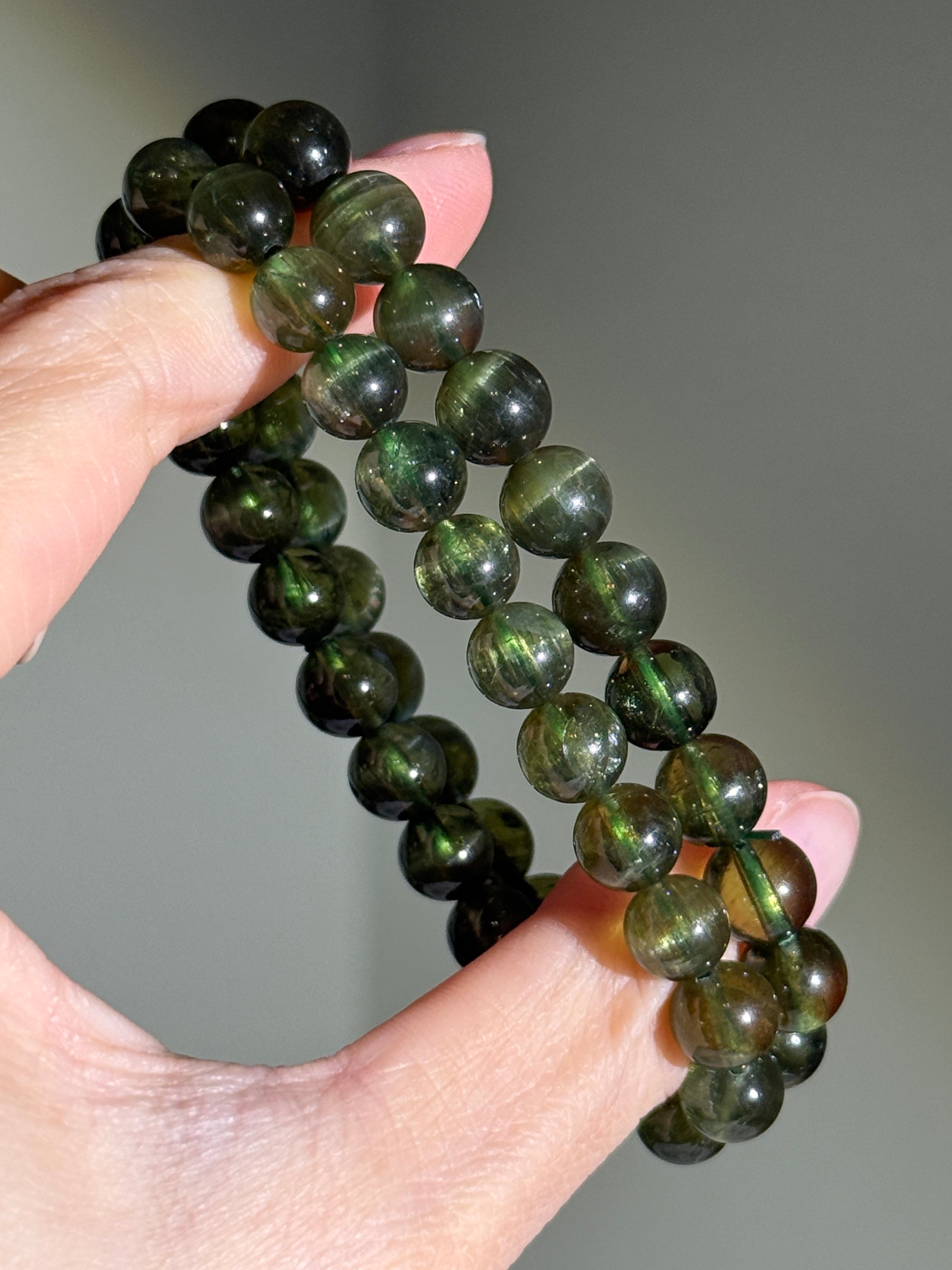 Collector's grade round beaded rare cat eye green apatite bracelets.