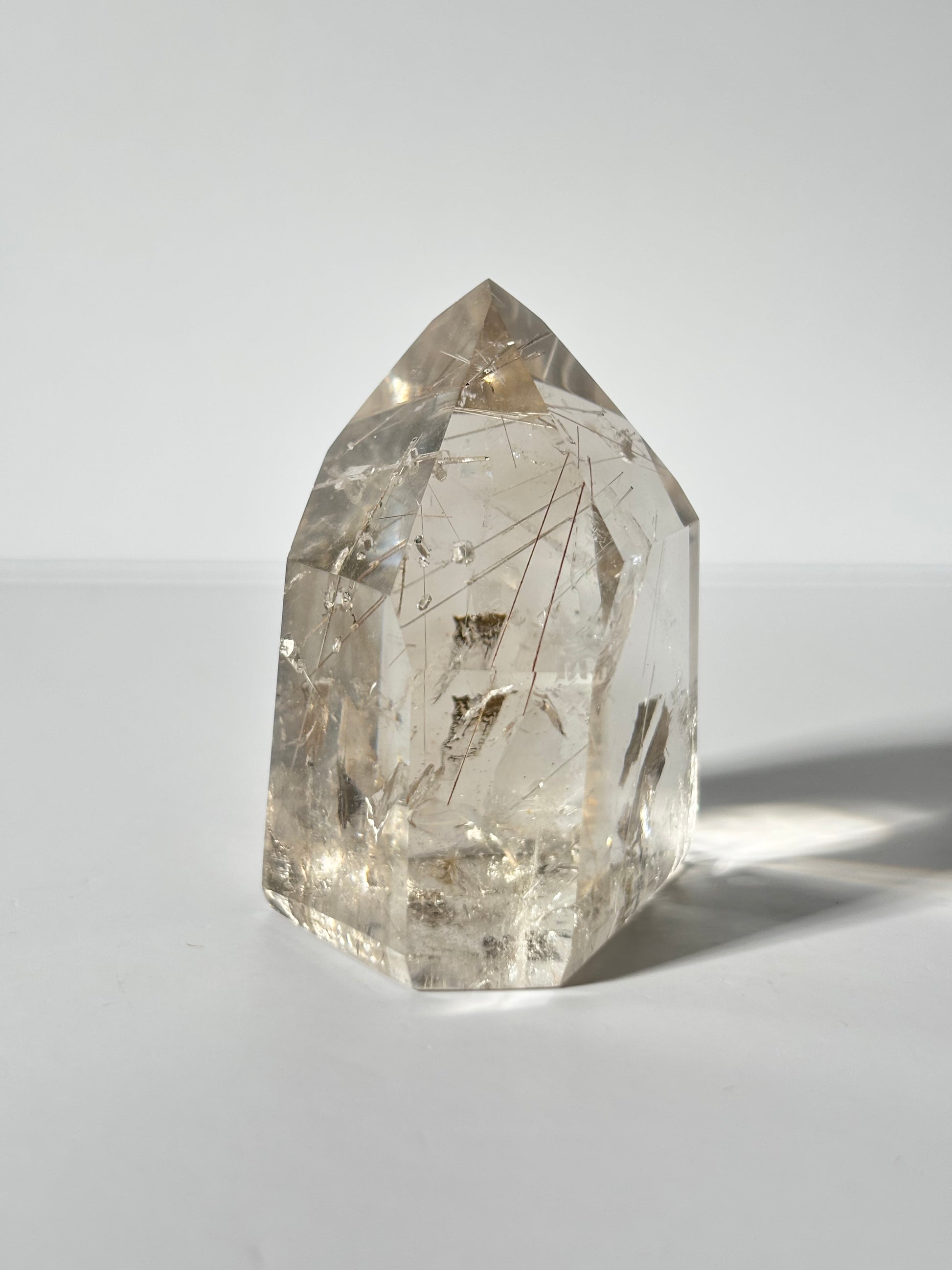 Large chunky collector’s grade rare silver rutile growing through manifestation quartz dts tower. Self standing.