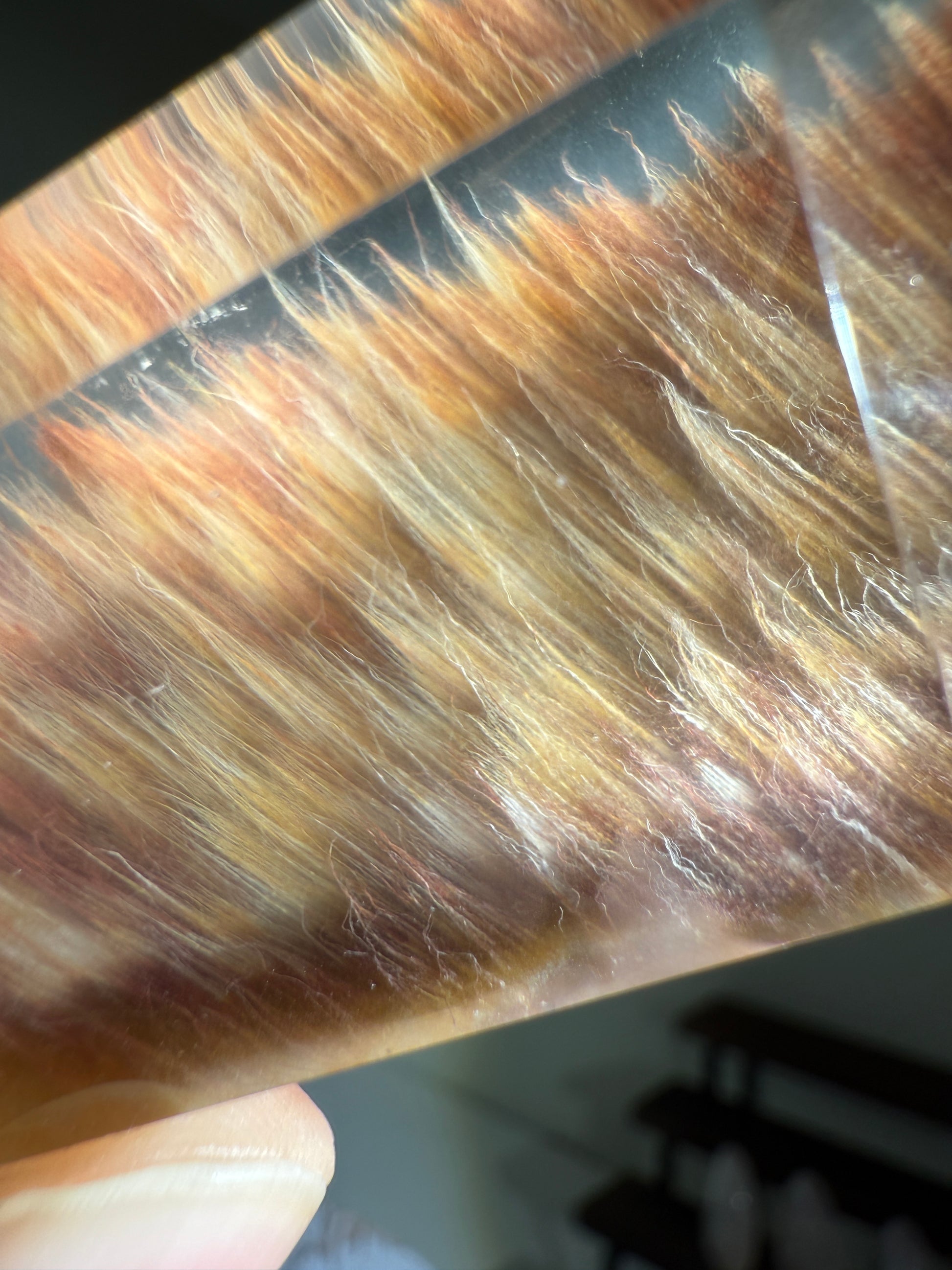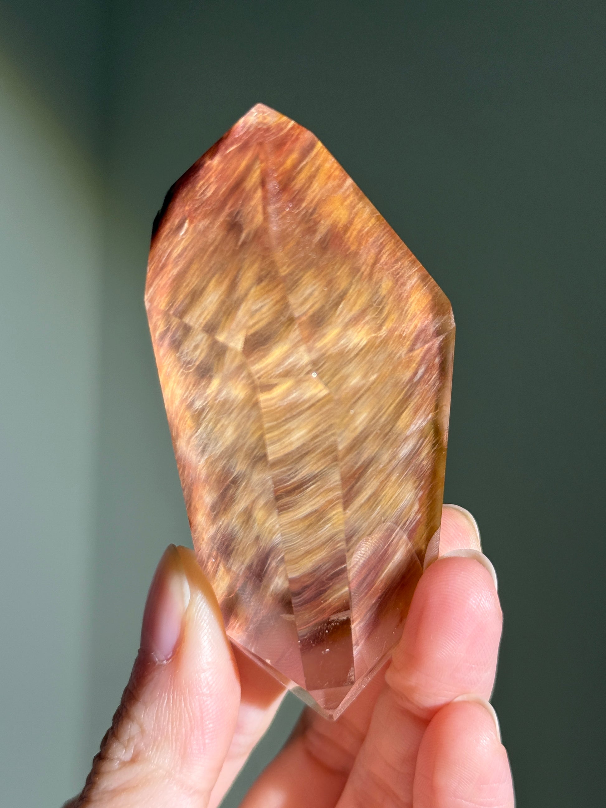 High quality water clear collector's grade orange and red amphibole quartz double terminated freeform. This type of amphibole quartz is often referred as rabbit hair quartz. Self Standing as shown in the picture.