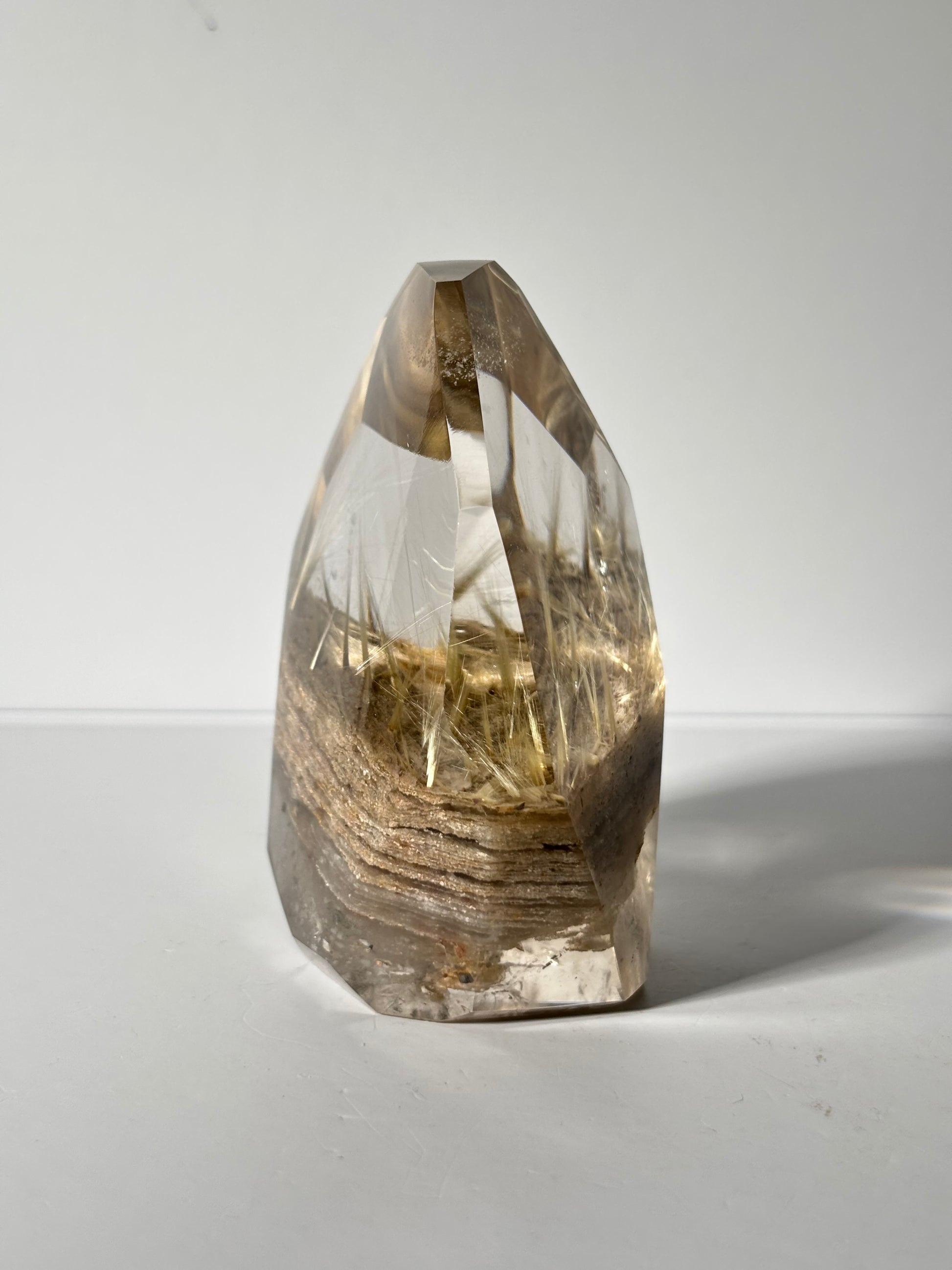 Statement high quality collector’s grade golden starburst rutile on layered lodalite Freeform. Self standing.