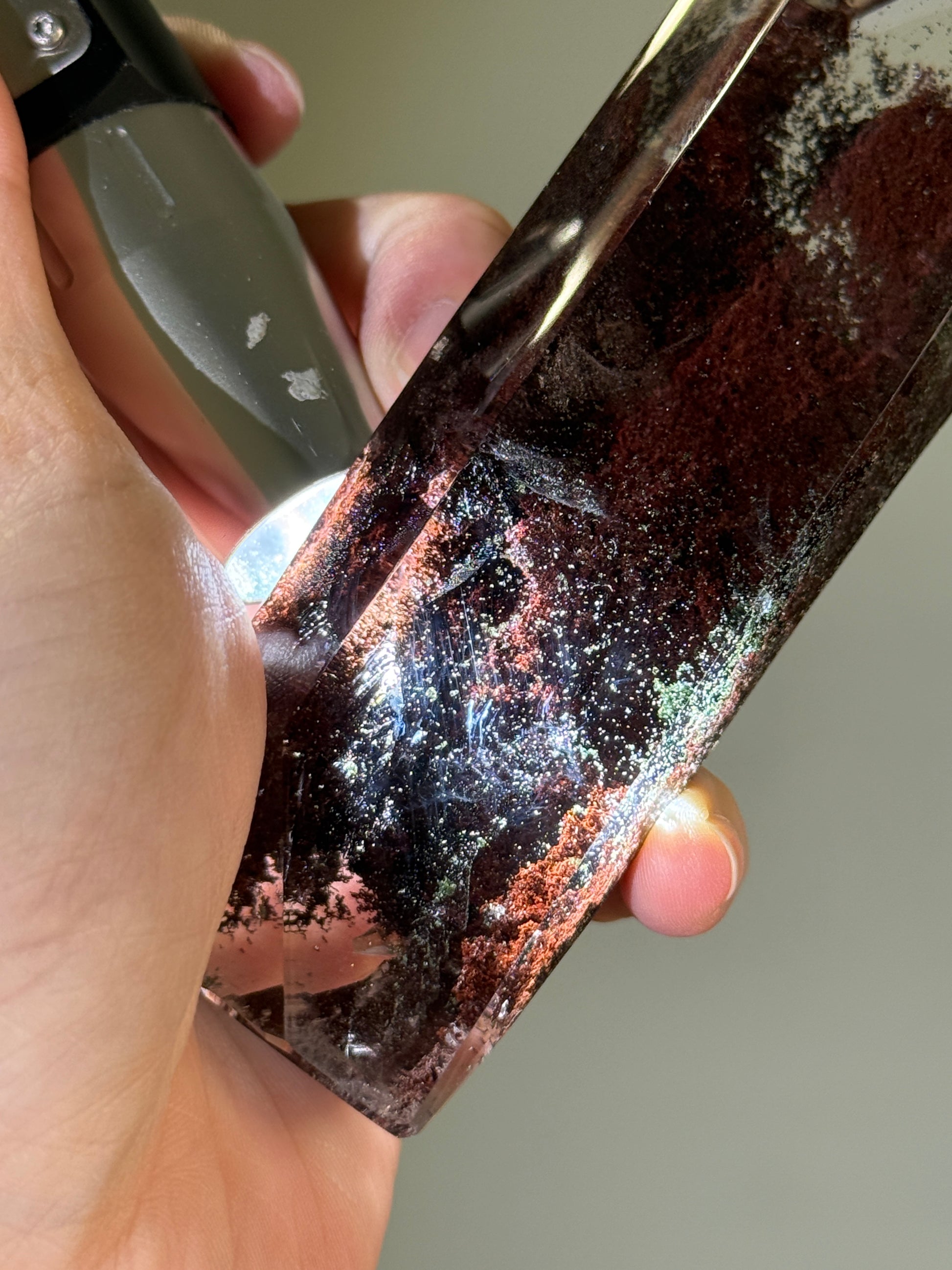 High quality collector's grade rare bright red garden quartz tower with blue angel feather inclusion.