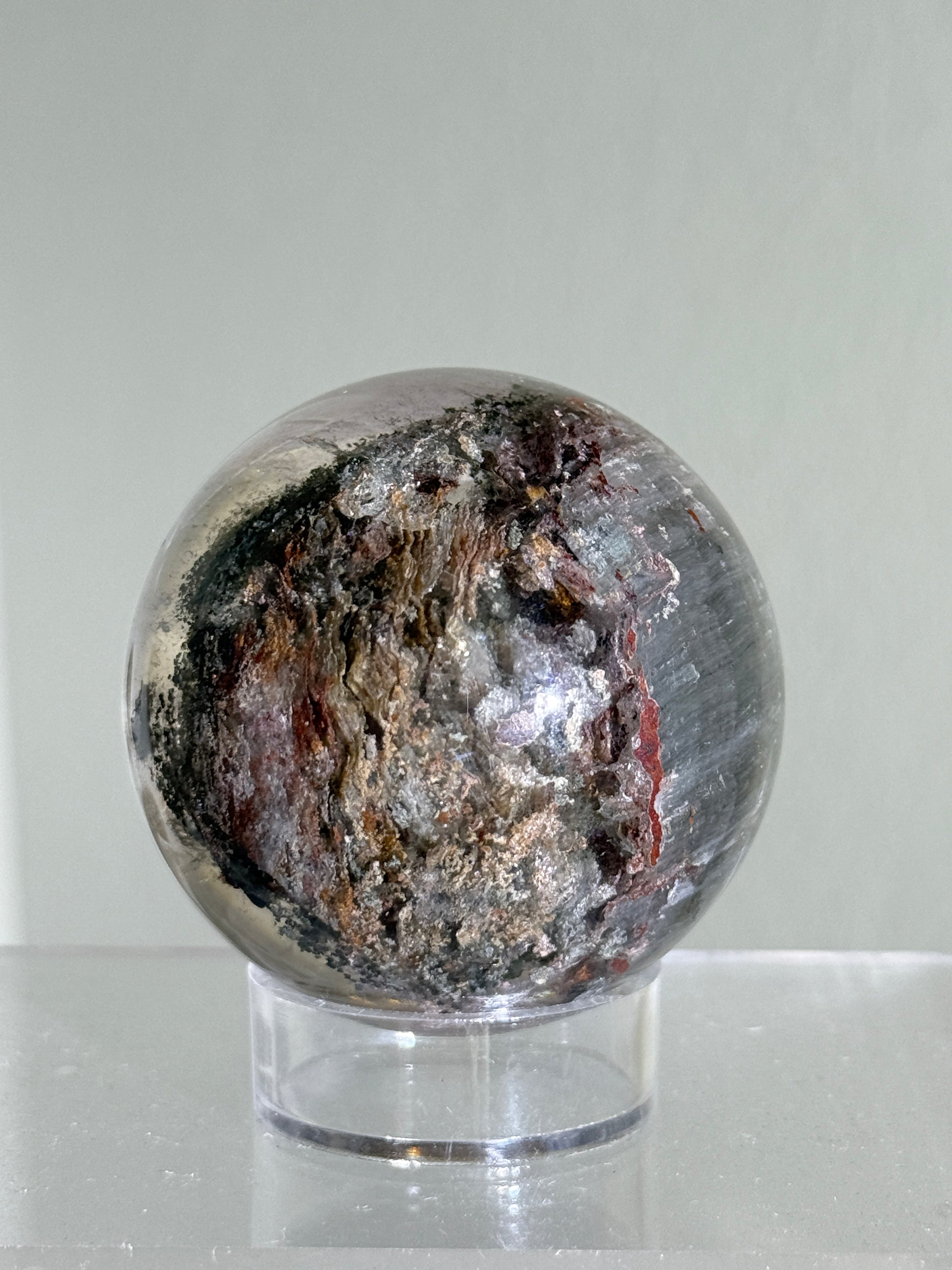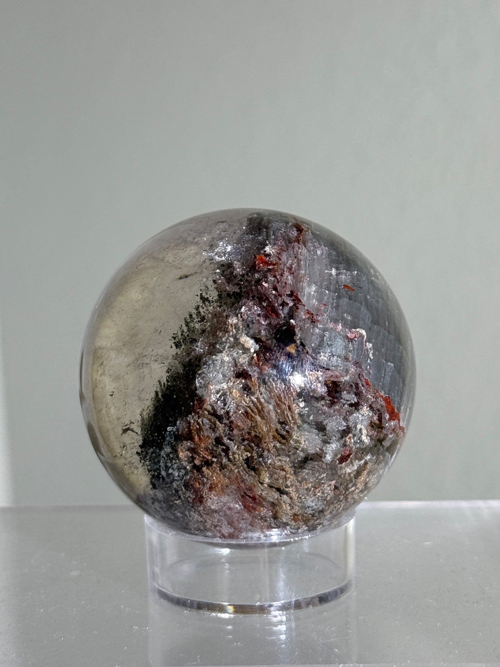 Large gorgeous rare colorful garden quartz sphere with heart shaped hematite inclusion.