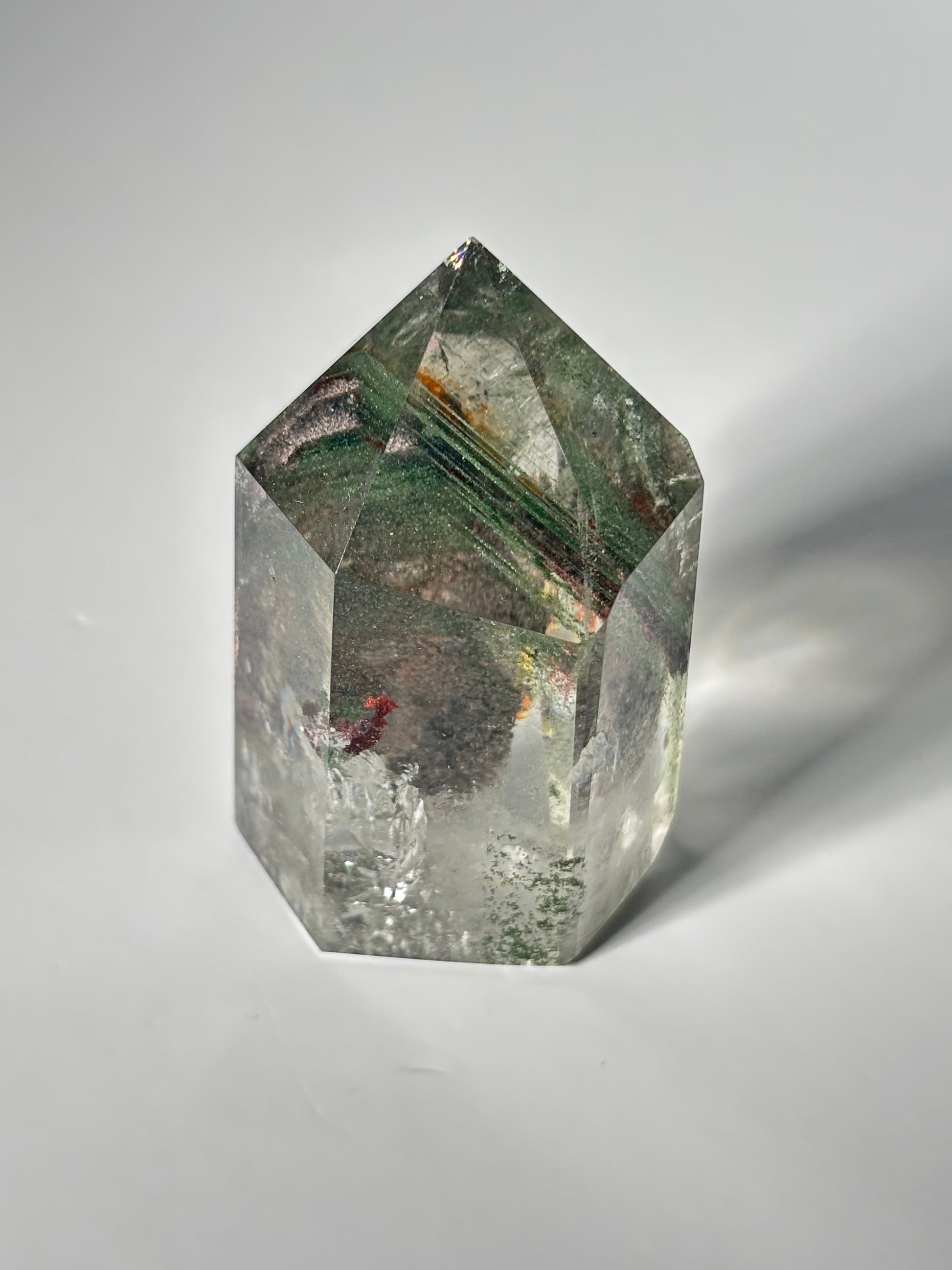 High quality green phantom chlorite and purple lodalite tower with rainbow. Self standing.