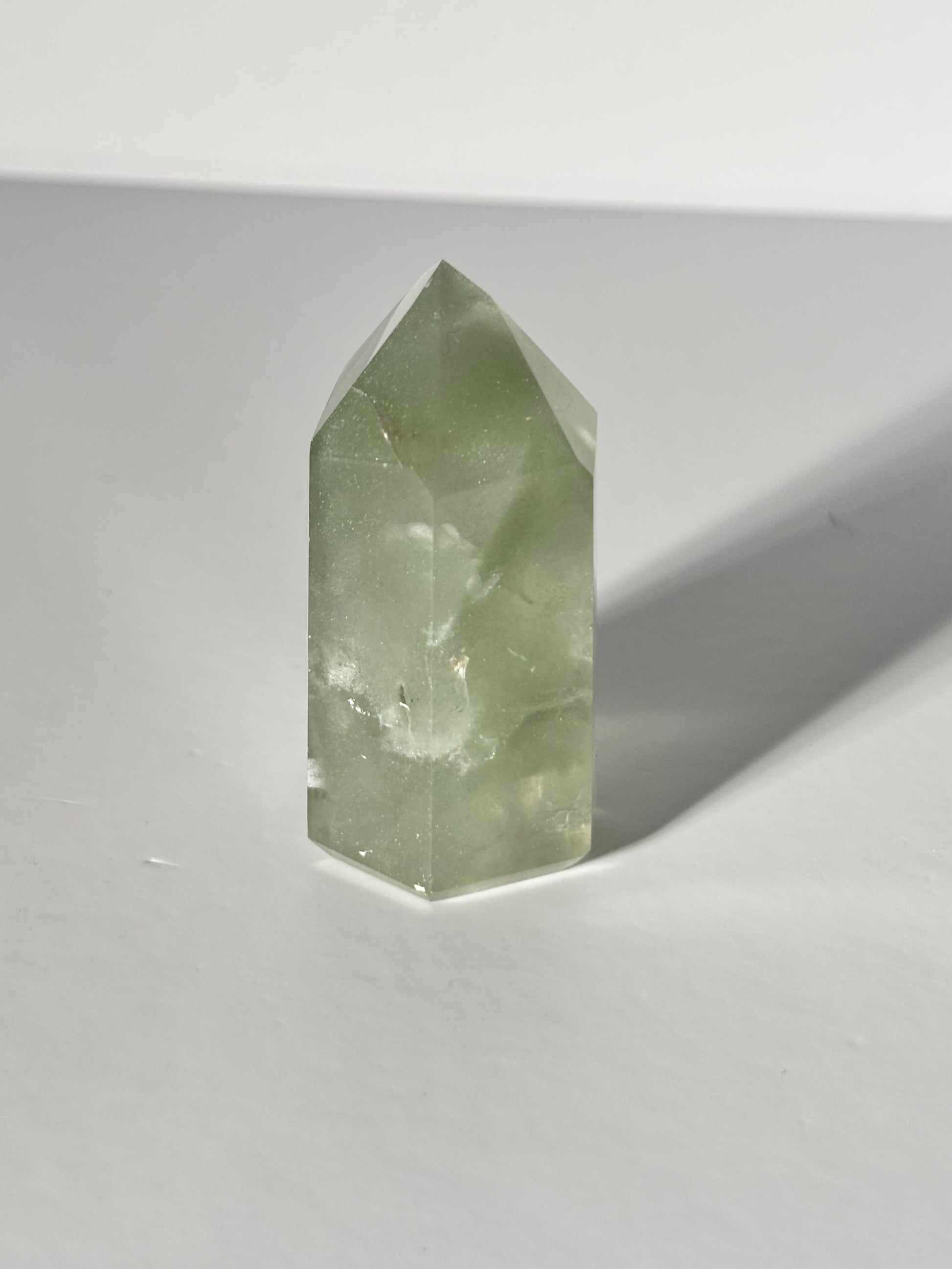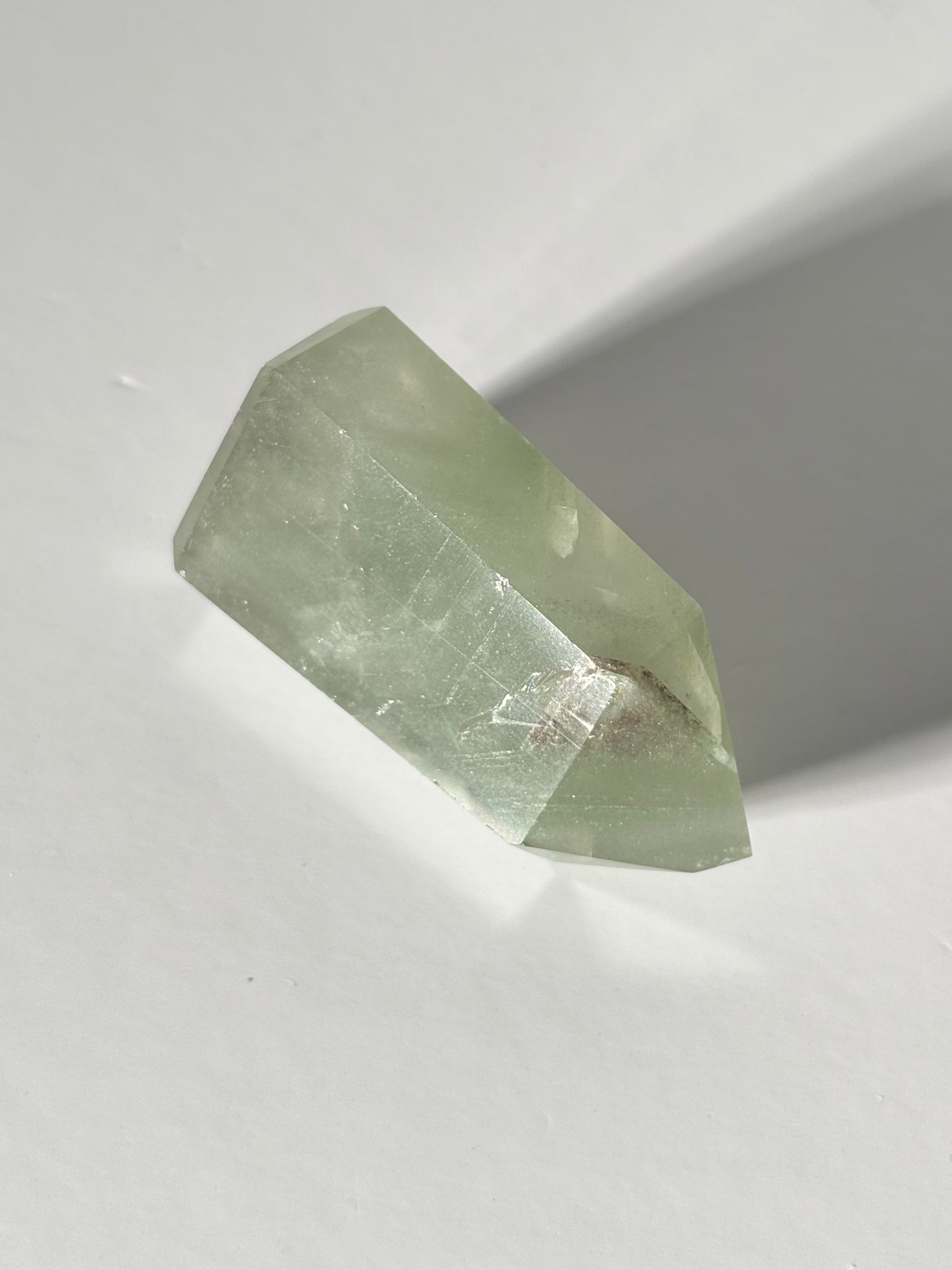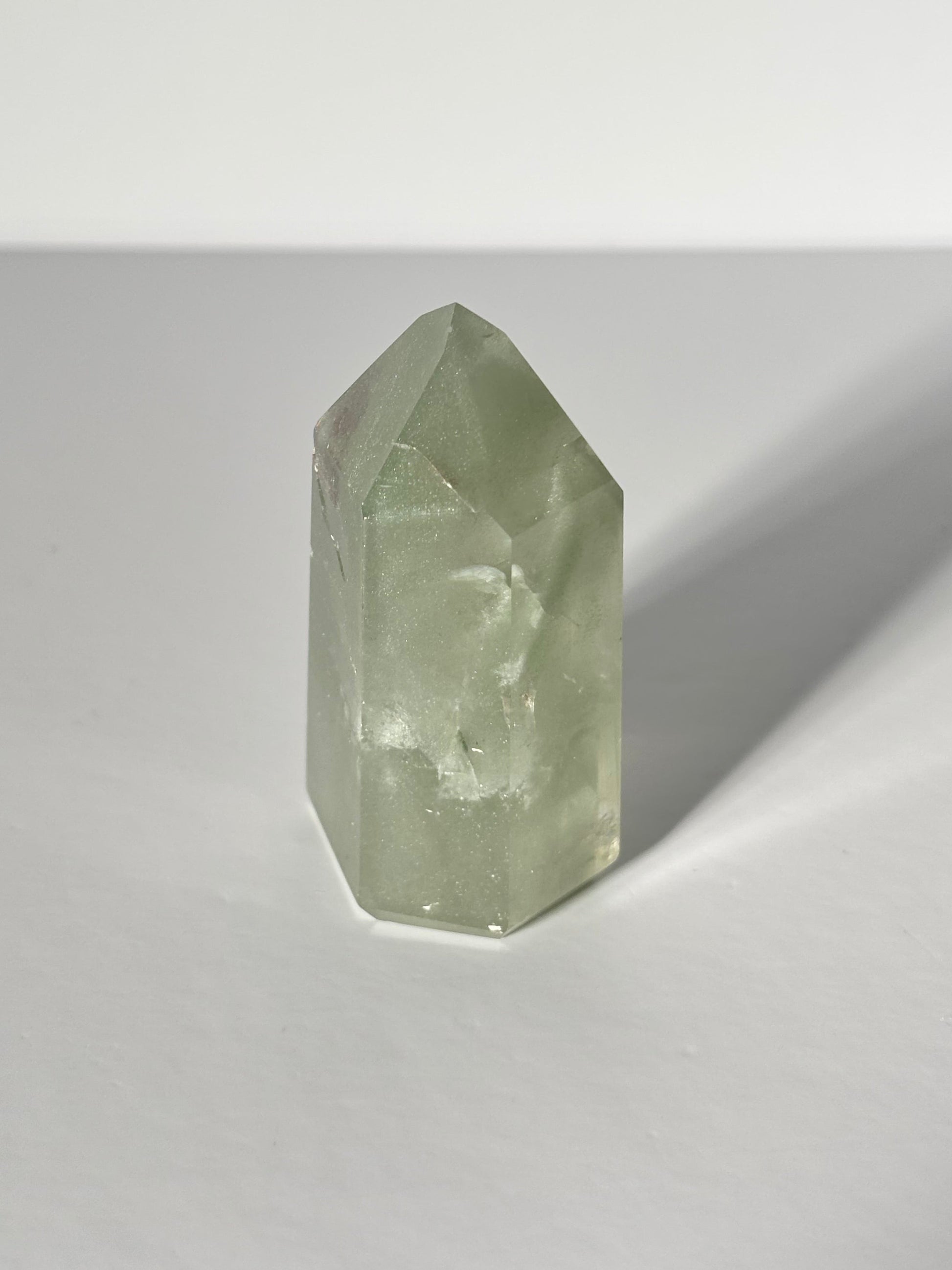 High quality fine layered green phantom chlorite quartz tower with rainbows . Self standing.