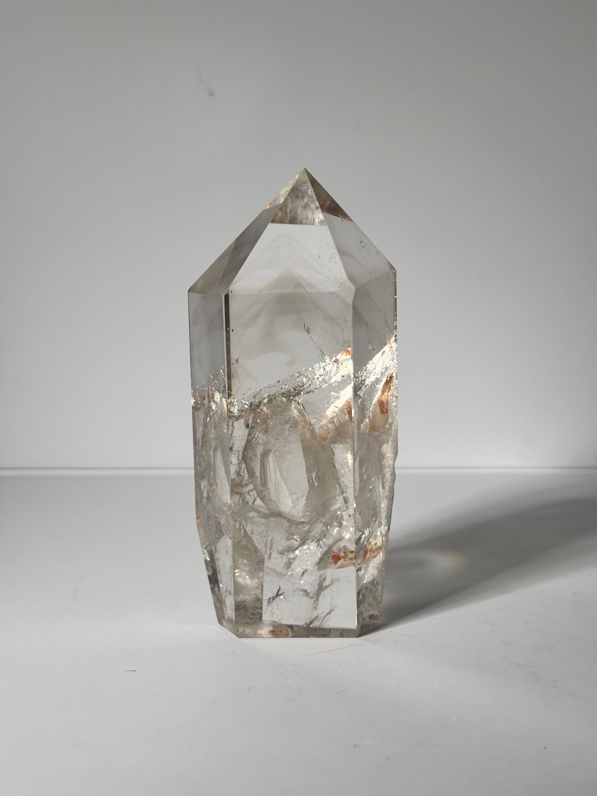 High quality water clear large penetrator quartz (crystal in crystal) tower with smoky phantoms. Self standing.