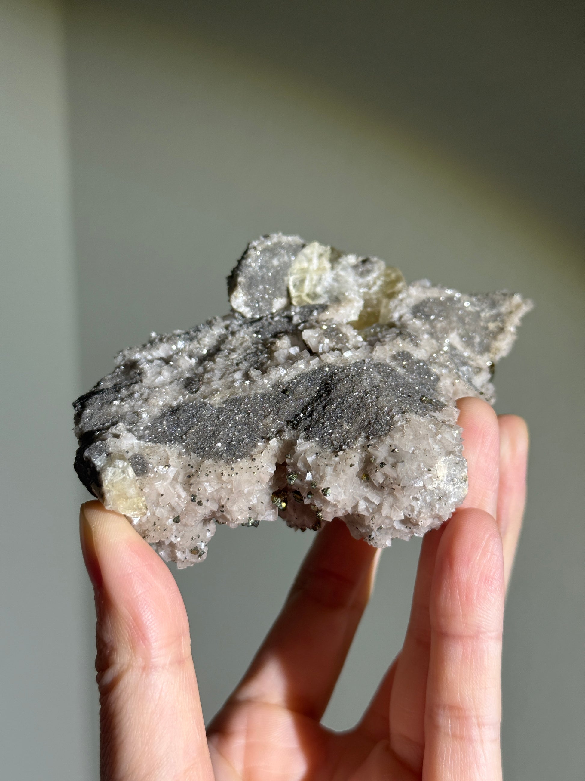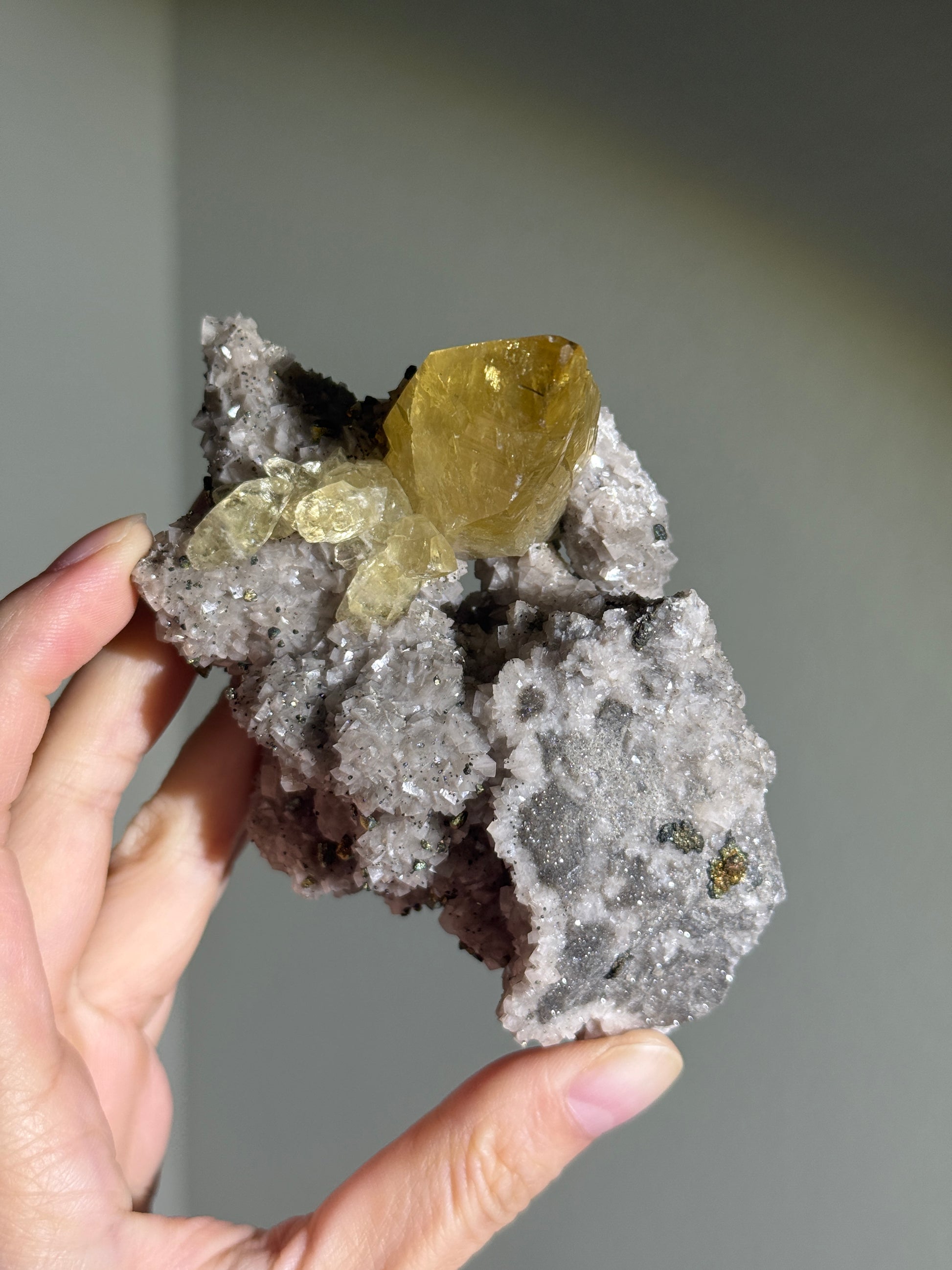 Large gorgeous dog tooth honey calcite on pink dolomite with chalcopyrite inclusion.