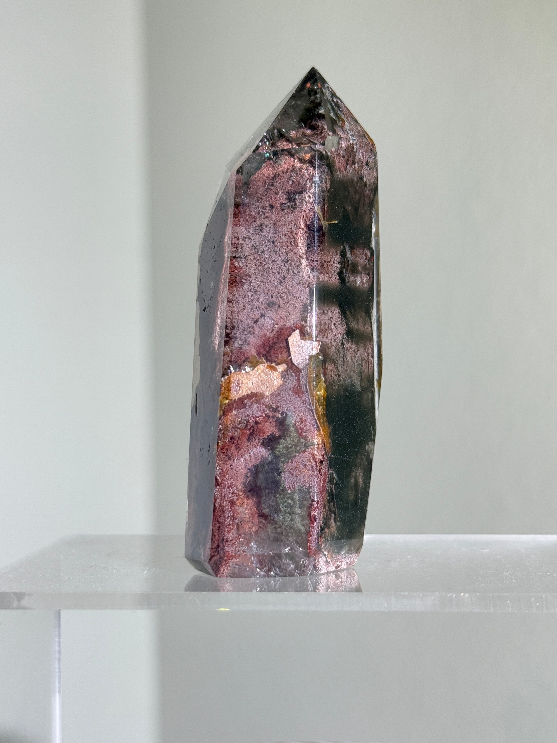 High quality large rare bright pink and green garden (lodalite) quartz tower. Self standing