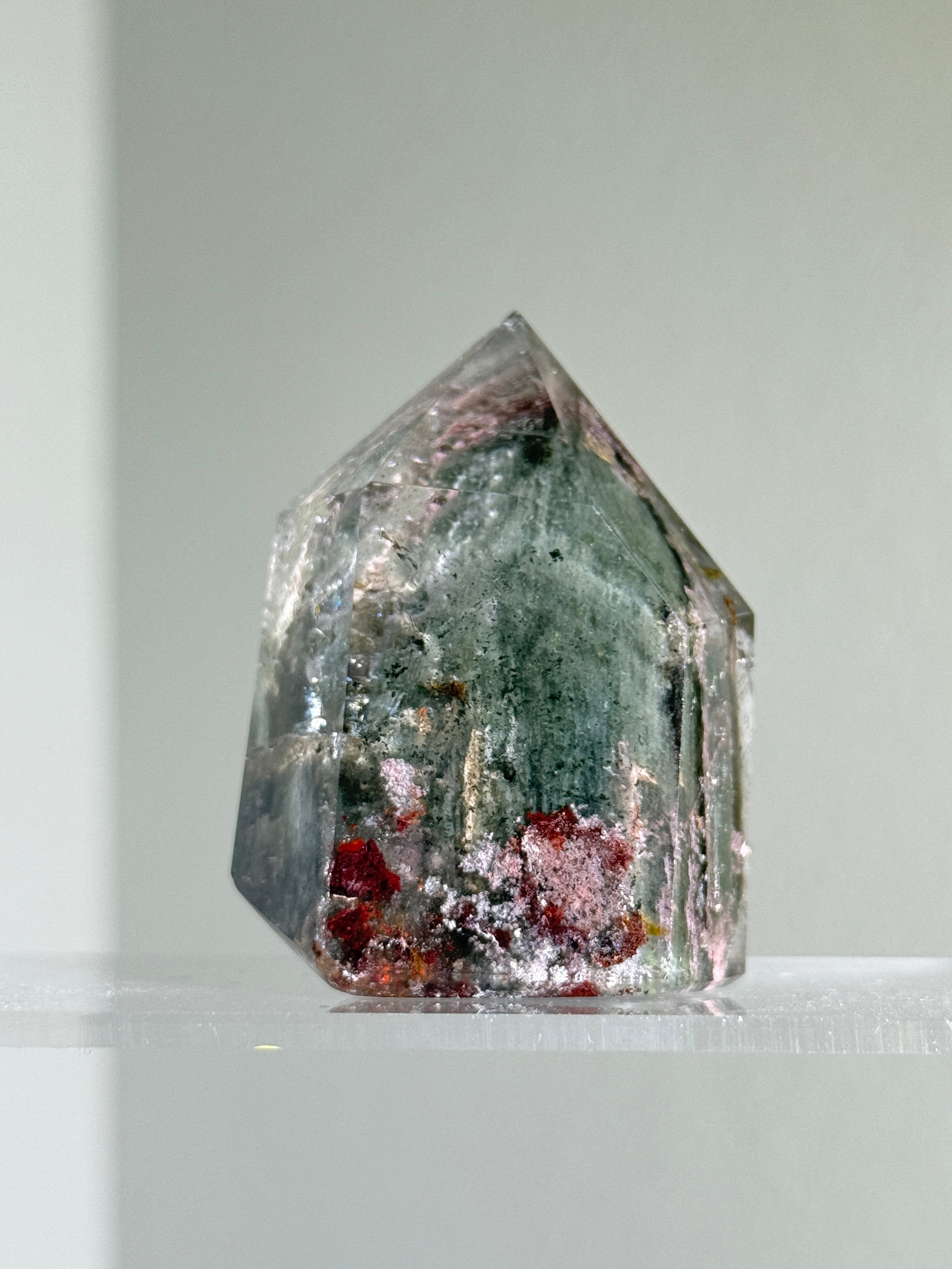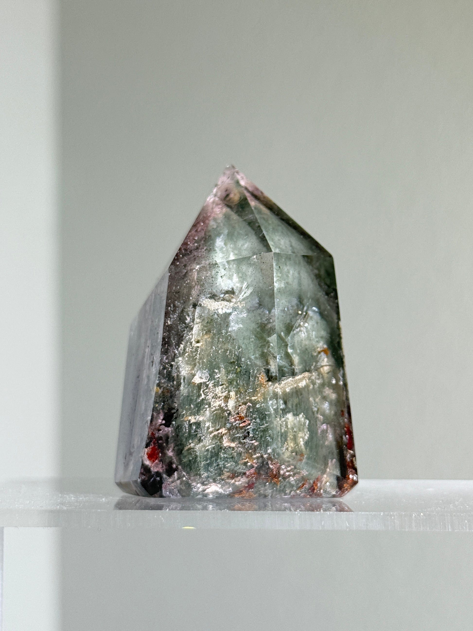High quality large pink and sage green garden (lodalite) quartz tower. Self standing