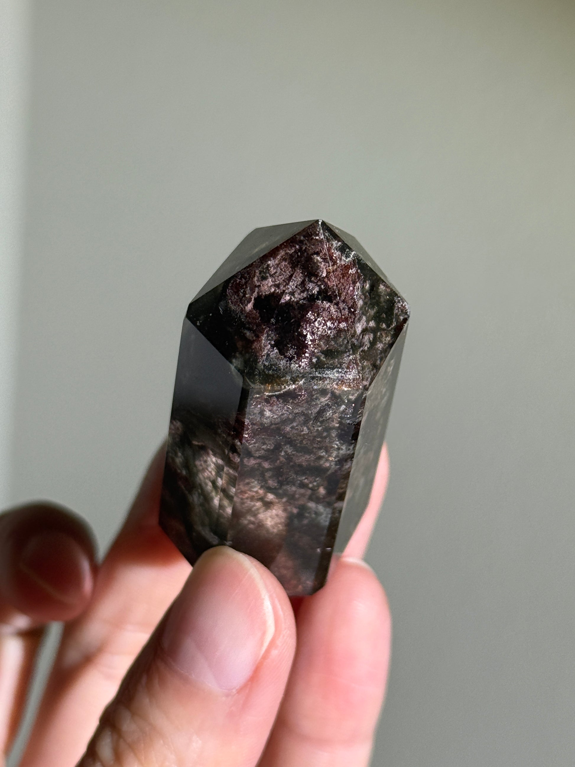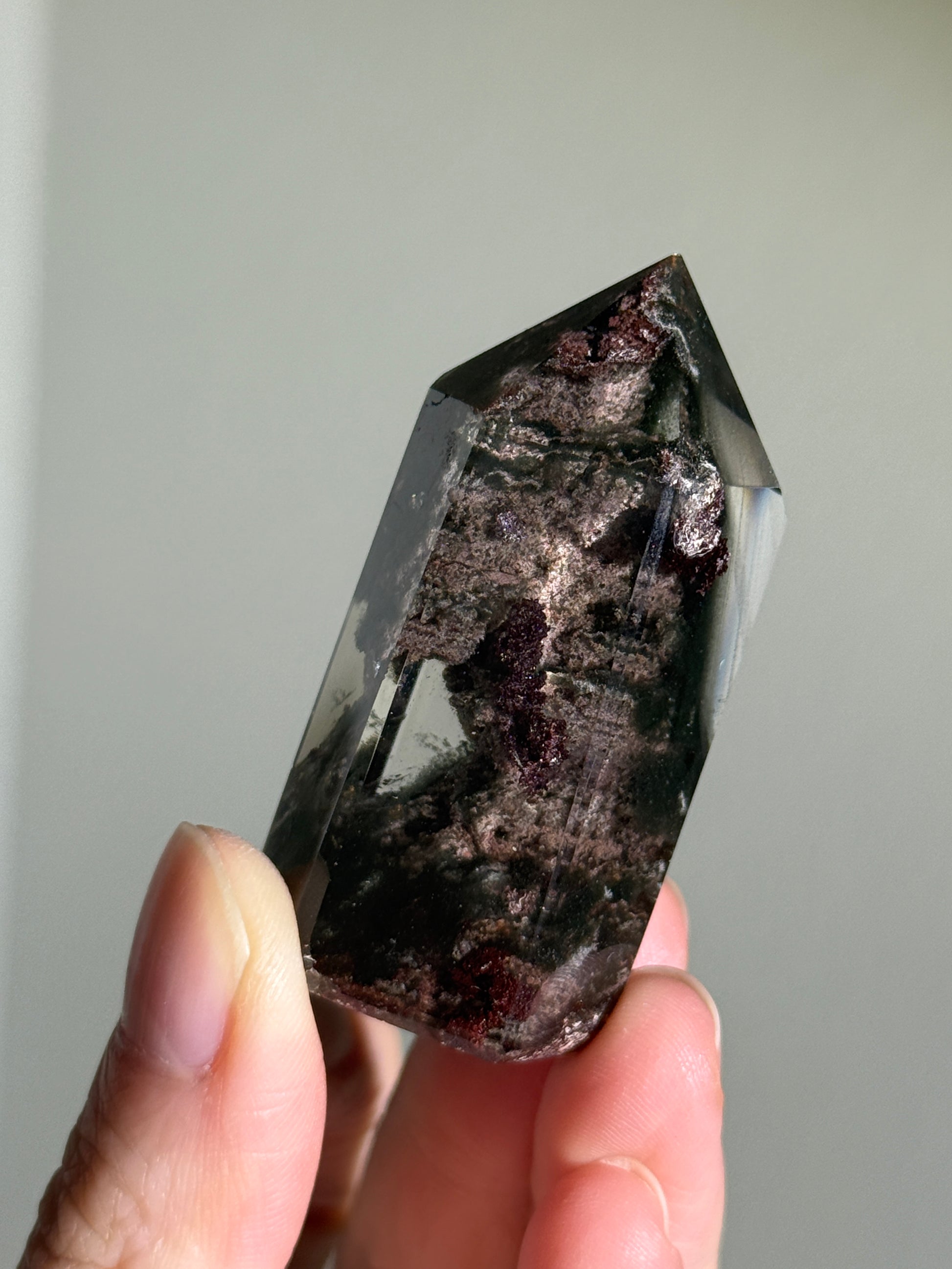 High quality rare purple and dark green garden (lodalite) quartz tower. Self standing