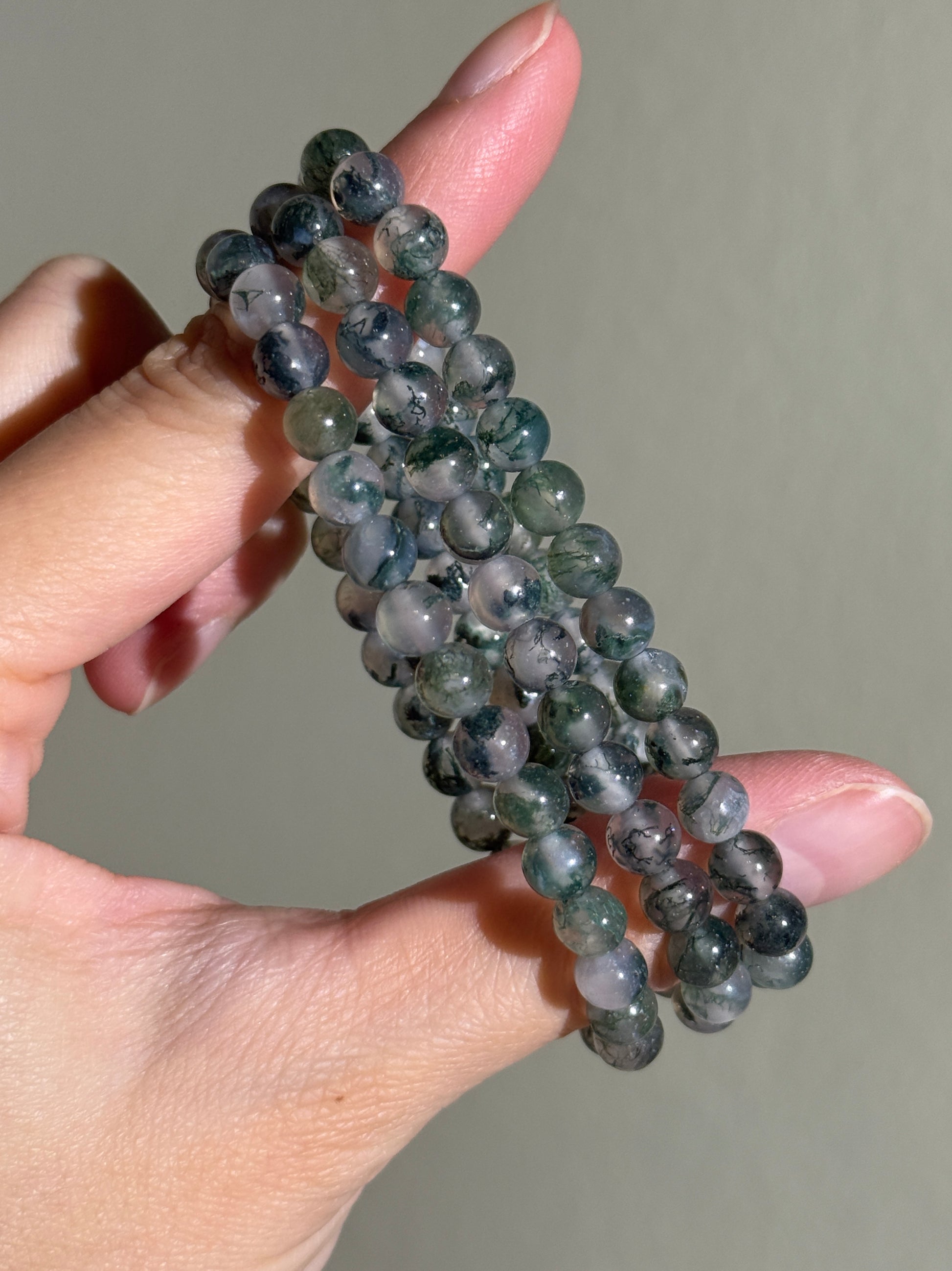 Our moss agate bracelets were carefully handpicked from our vendor. Each bracelet is created with care and hand-strung with elastic string.