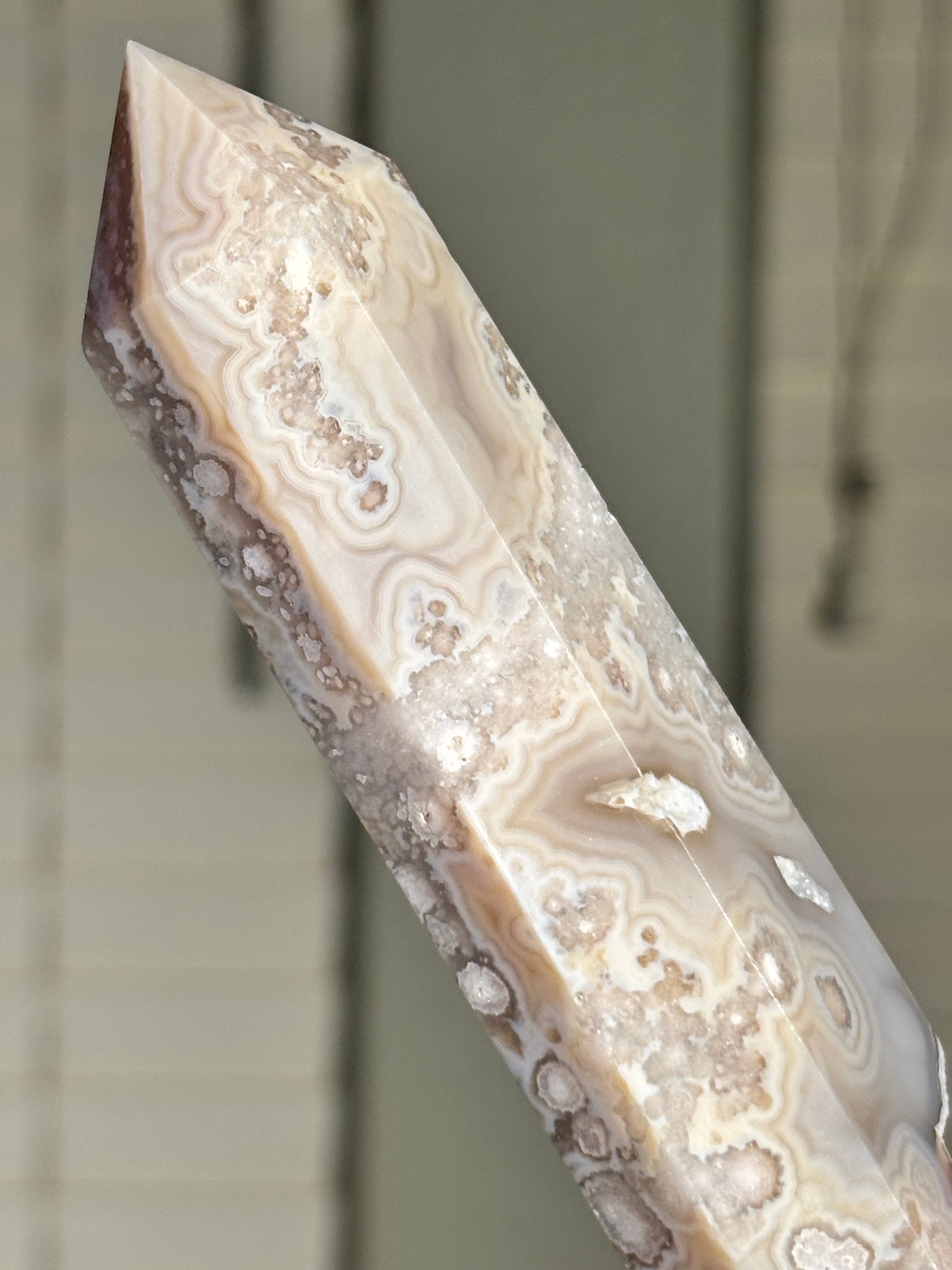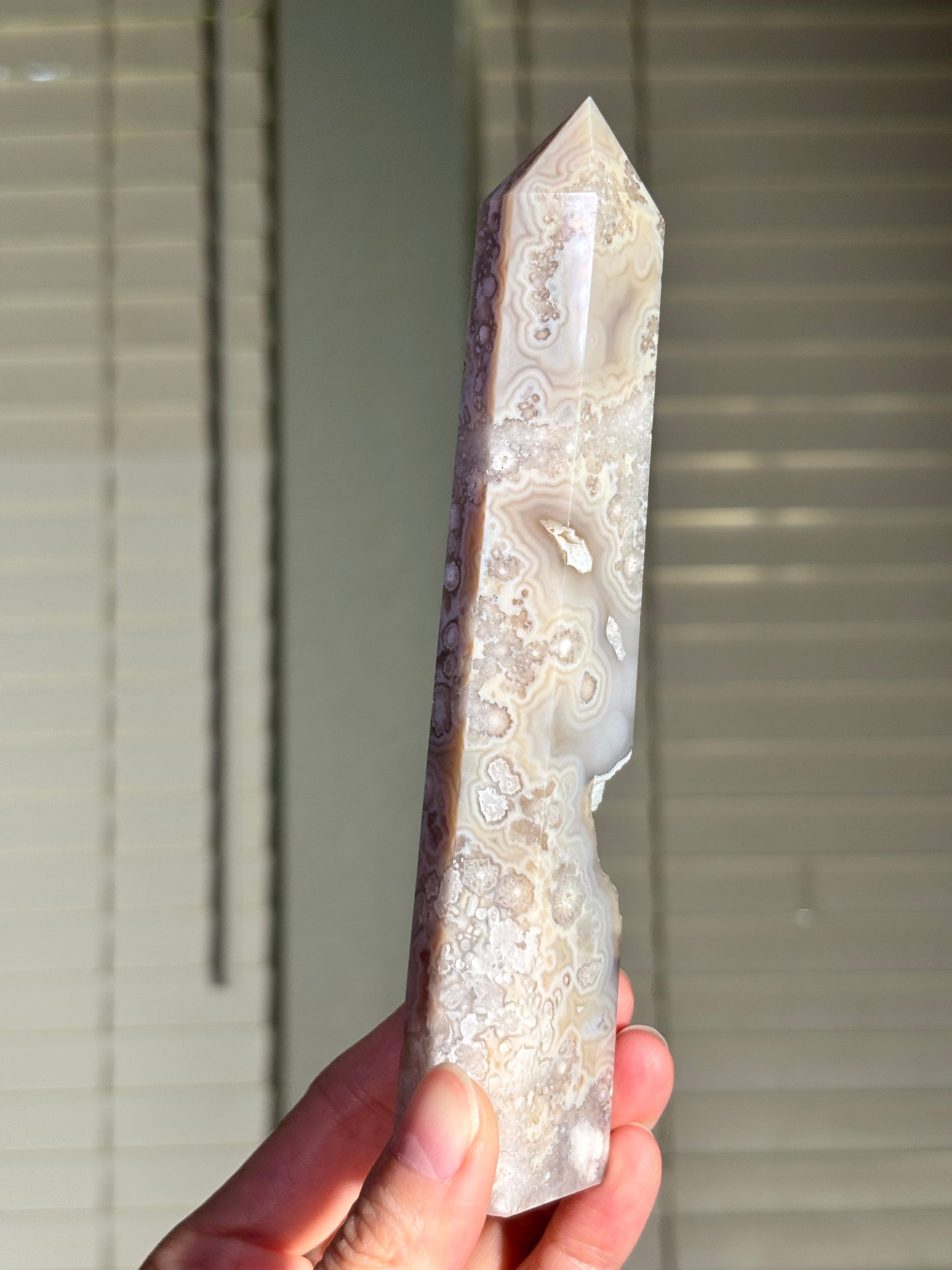 High quality unique cream beige flower agate tower with lots of details. Self standing.