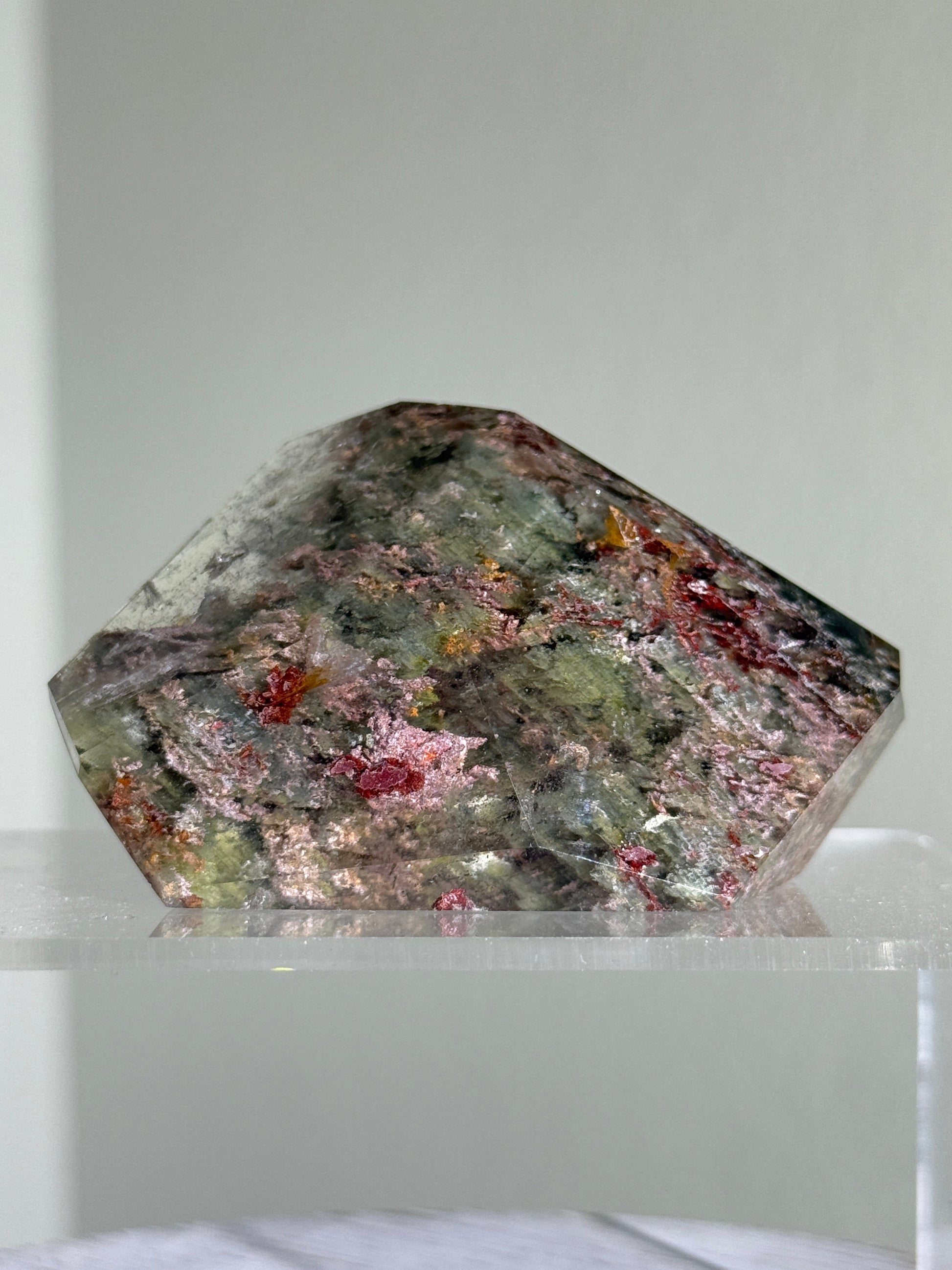 High quality vibrant green and pink garden (lodalite) quartz freeform. Self standing