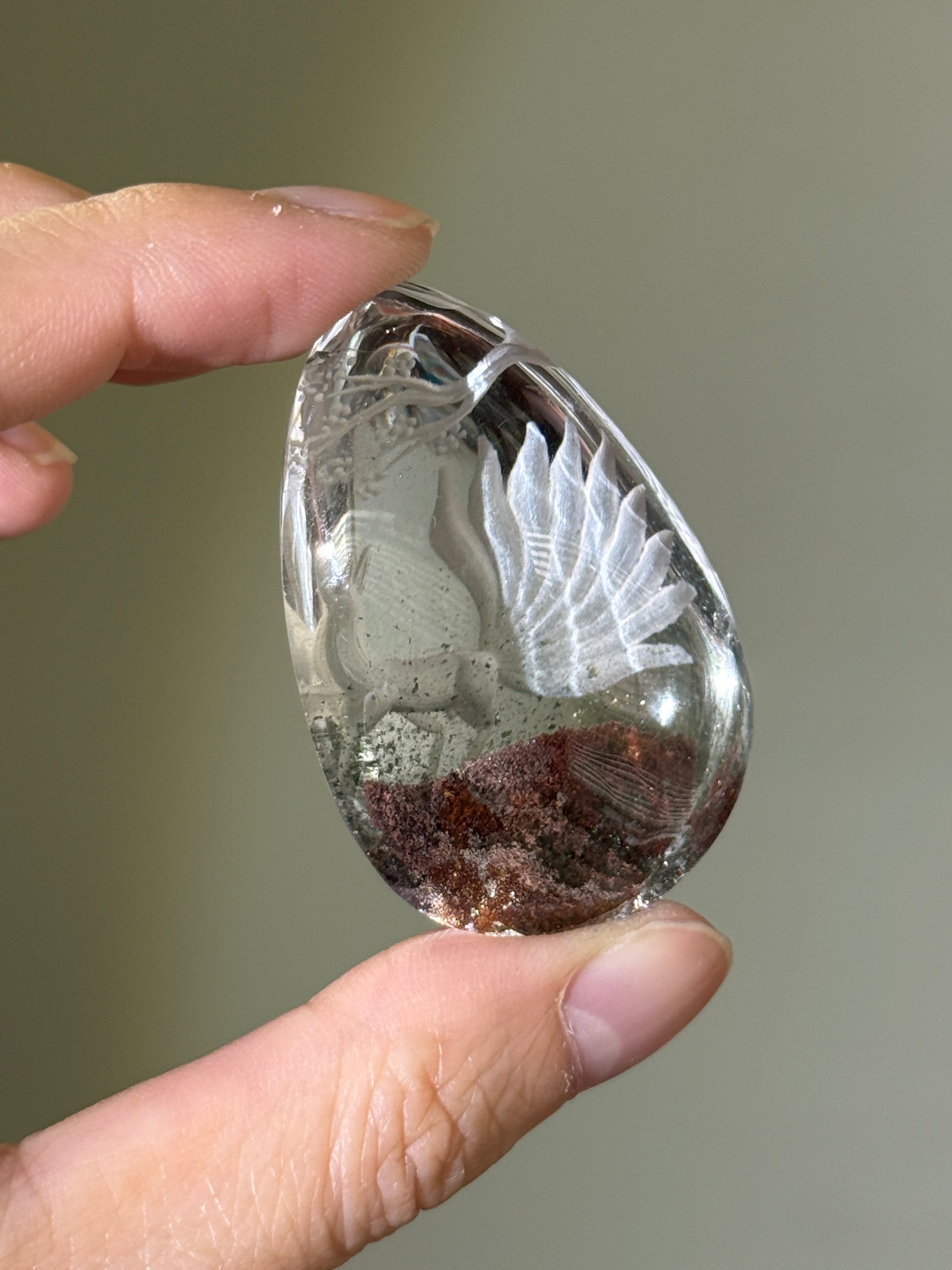 High quality collector's grade water clear garden quartz teardrop with back etched 9 tail fox pattern.