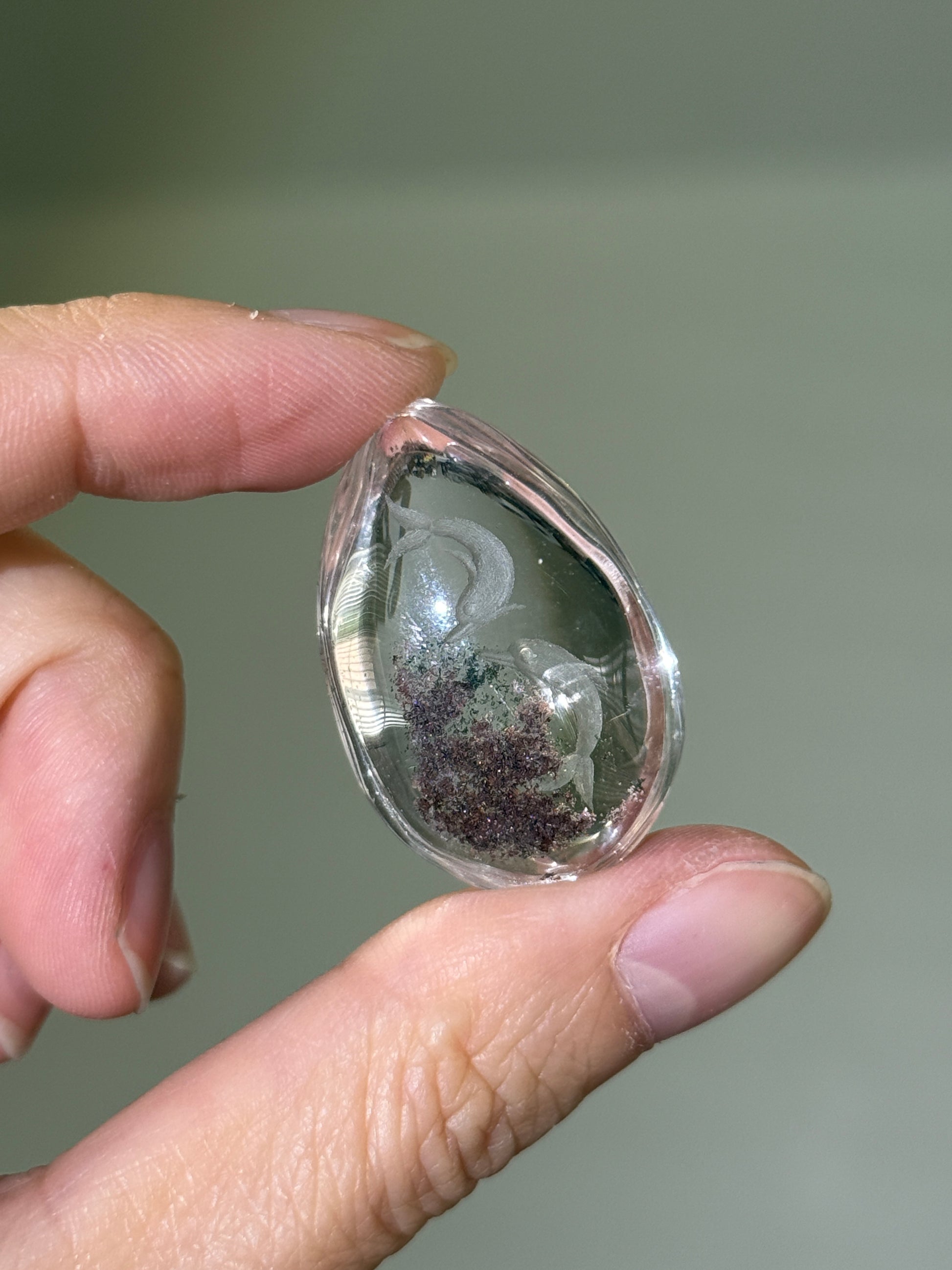 High quality water clear garden quartz teardrop with back etched double dophin pattern.