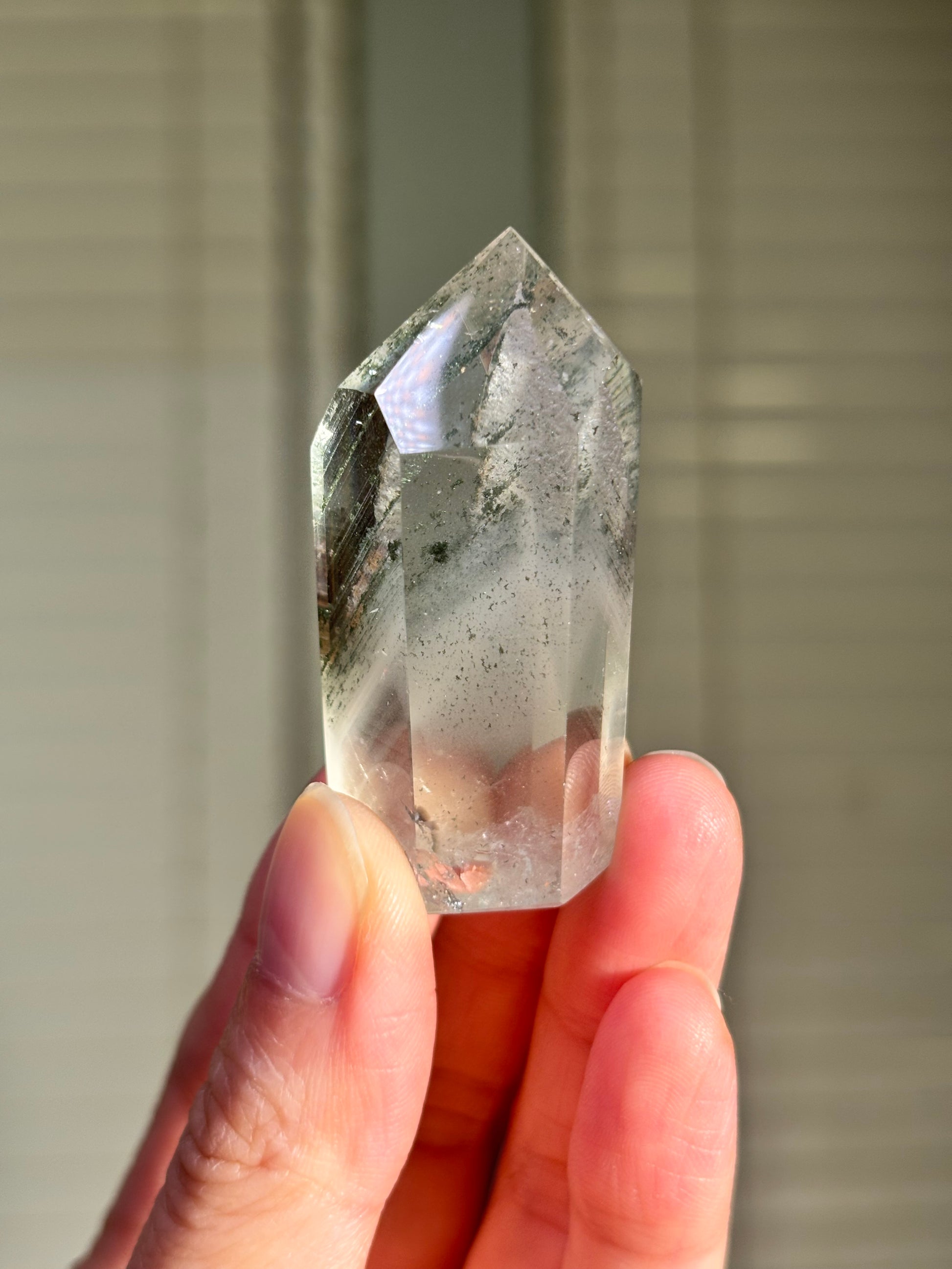 High quality uncommon water clear green and white phantom chlorite quartz tower. Self standing