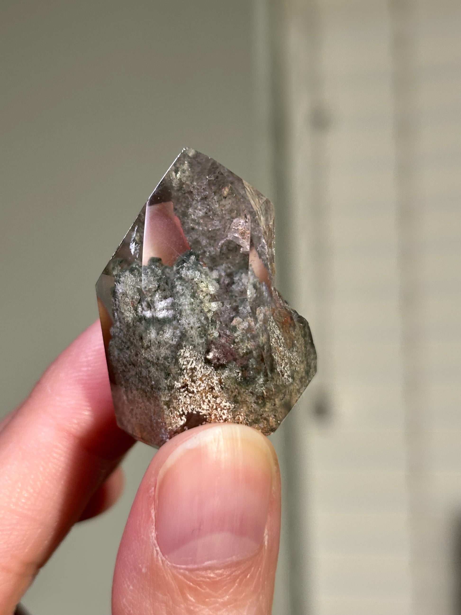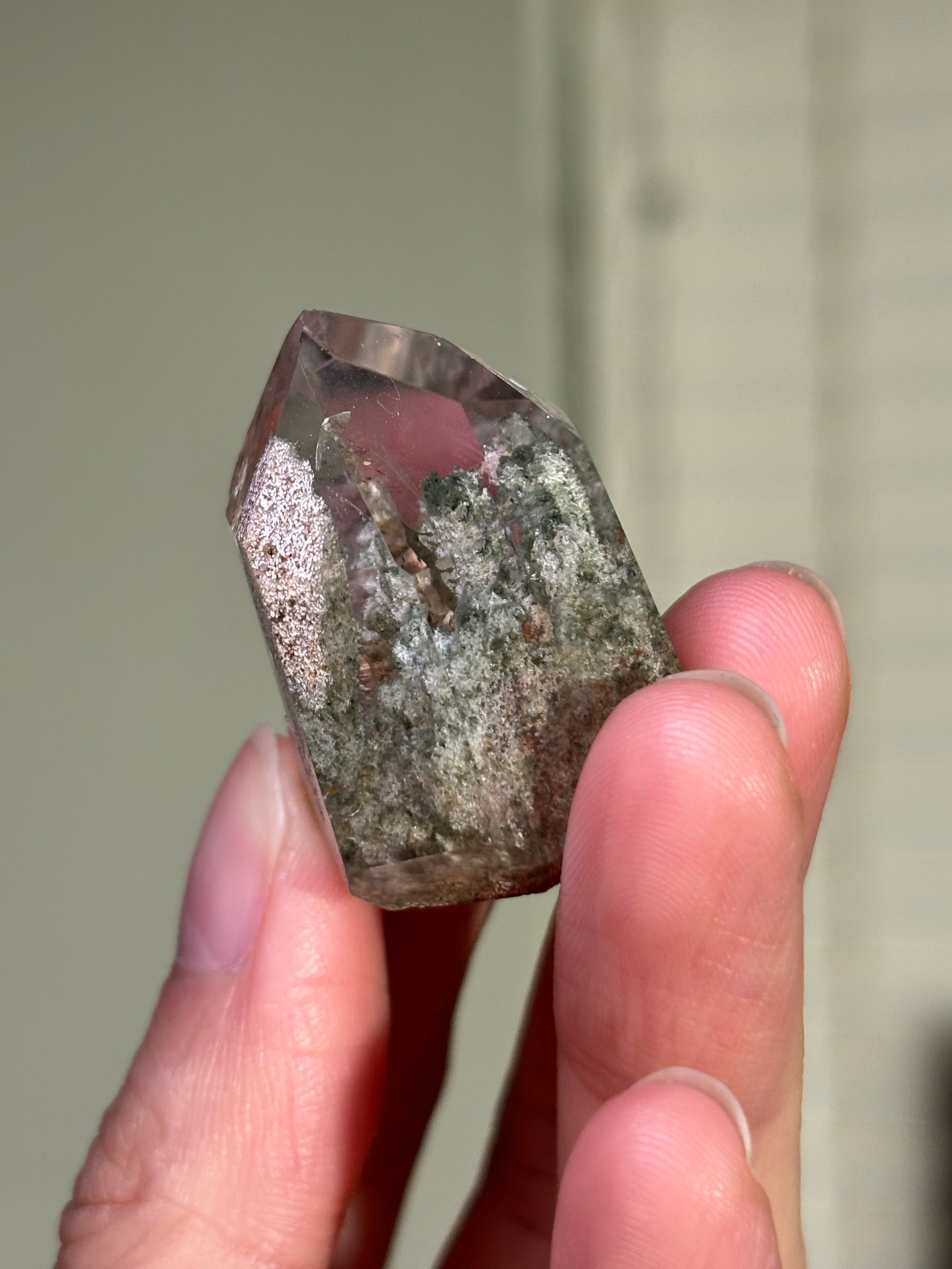 High quality water clear green and white lodalite quartz tower. Self standing.
