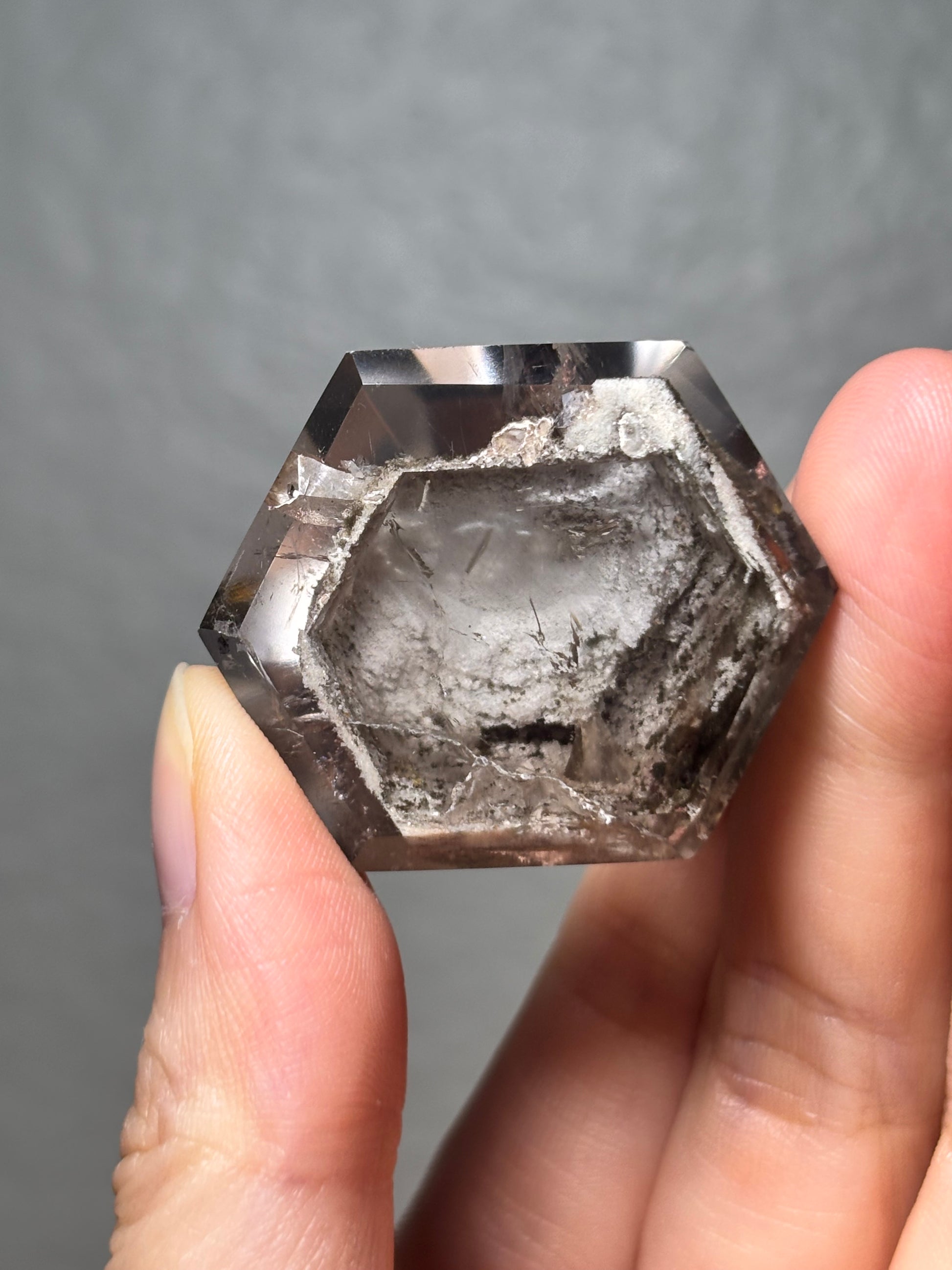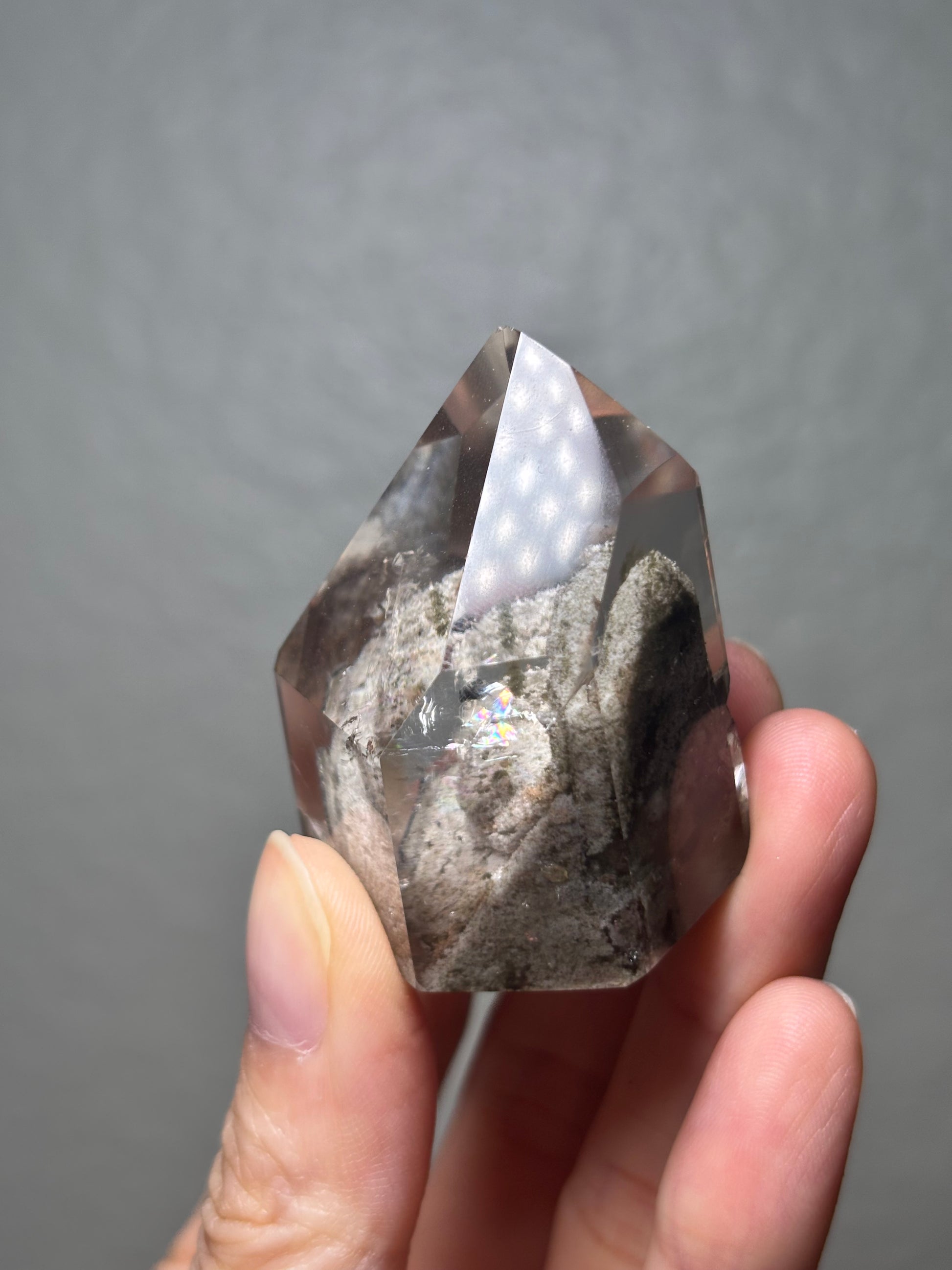 High quality chunky moody white phantom lodalite with manifestation quartz (crystal in crystal). Self standing.