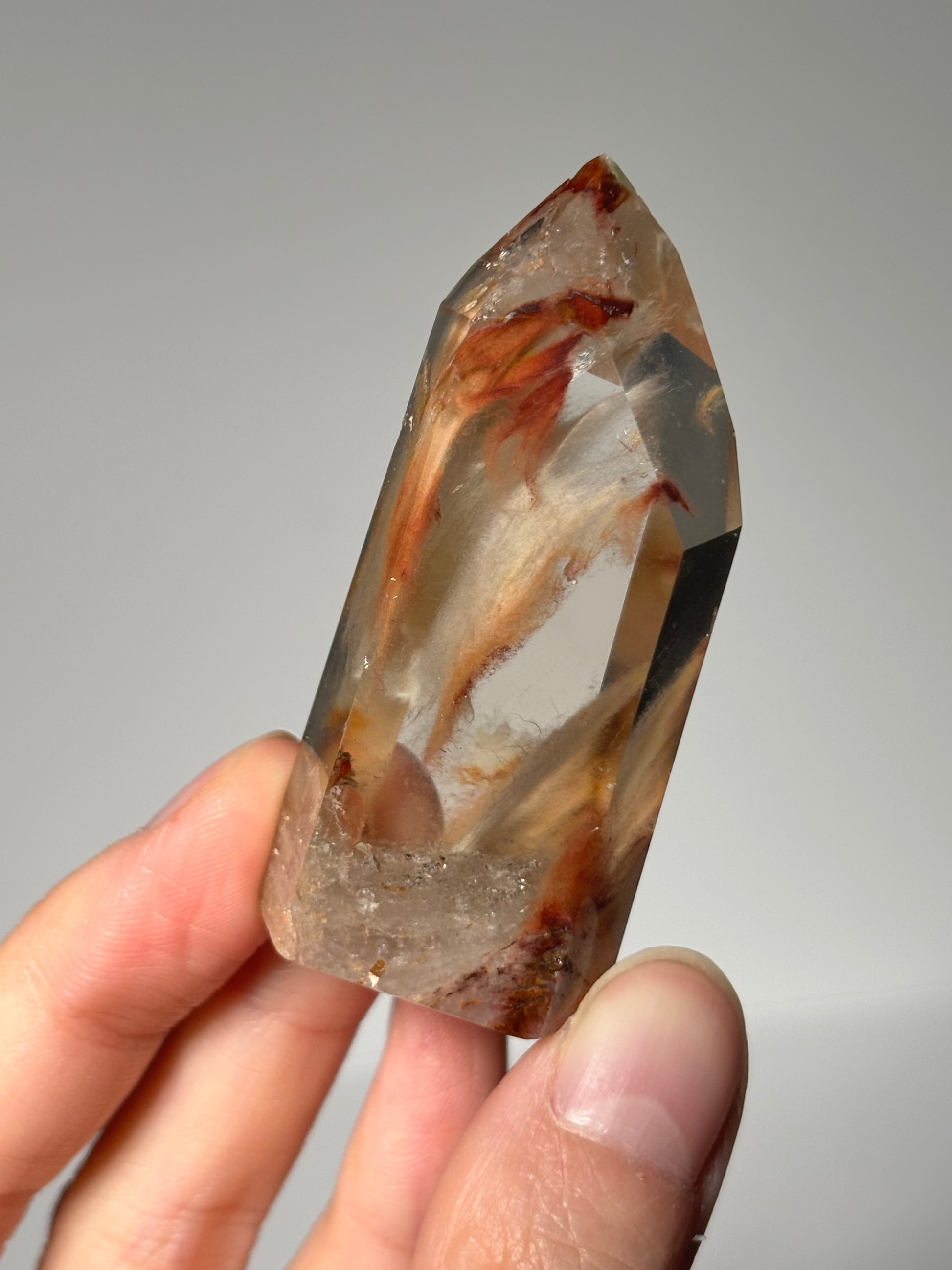 High quality water clear peachy amphibole Quartz tower. Self standing.