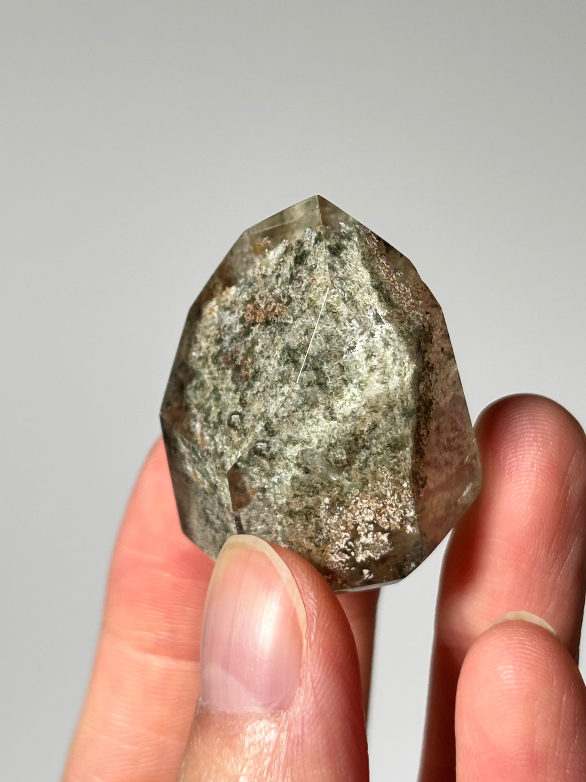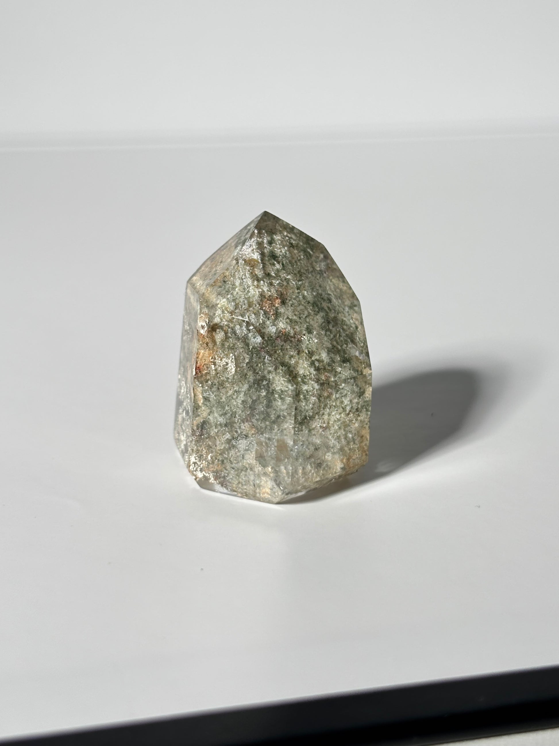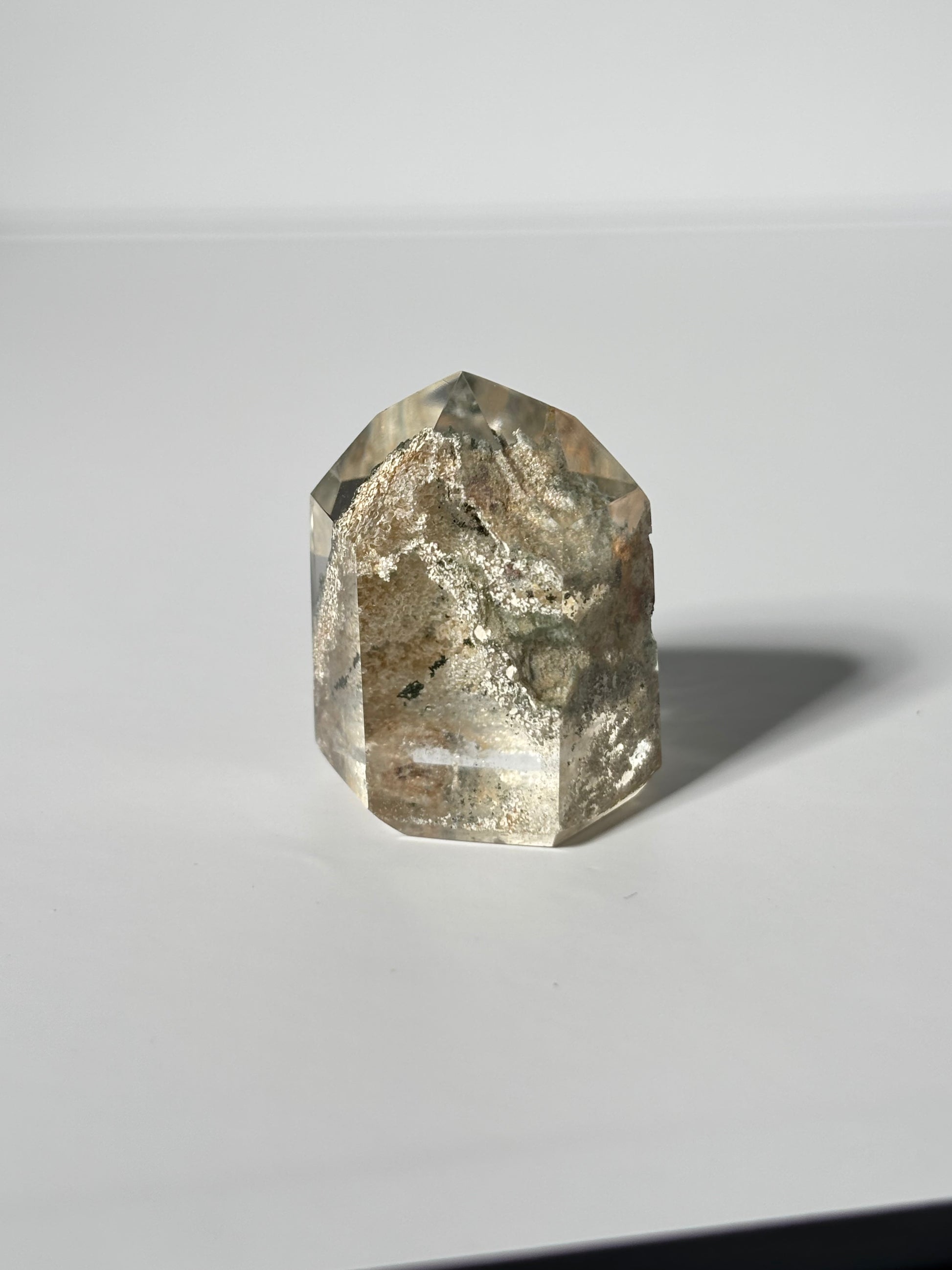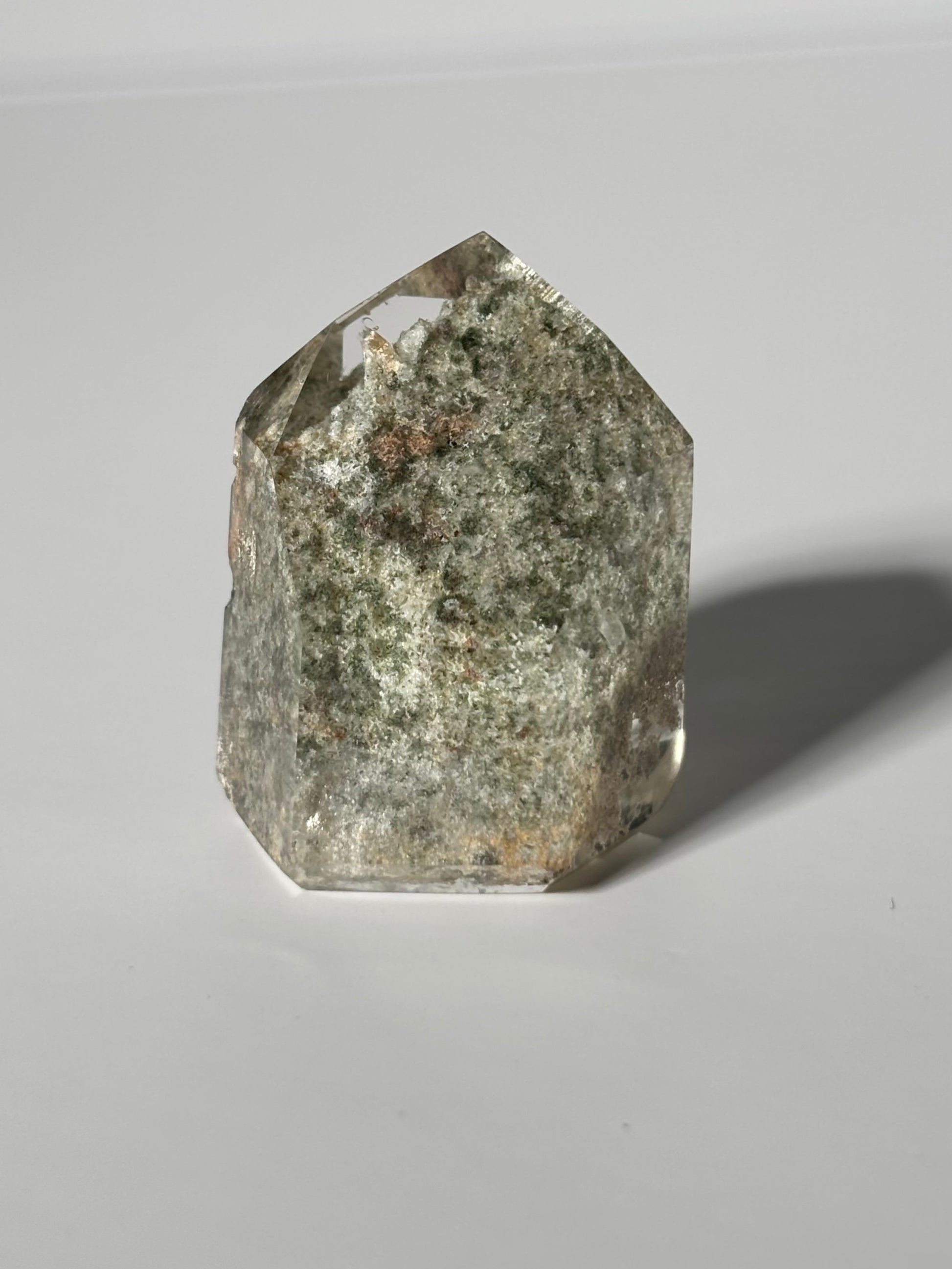 High quality water clear sage green and cream phantom lodalite quartz tower. Self standing.