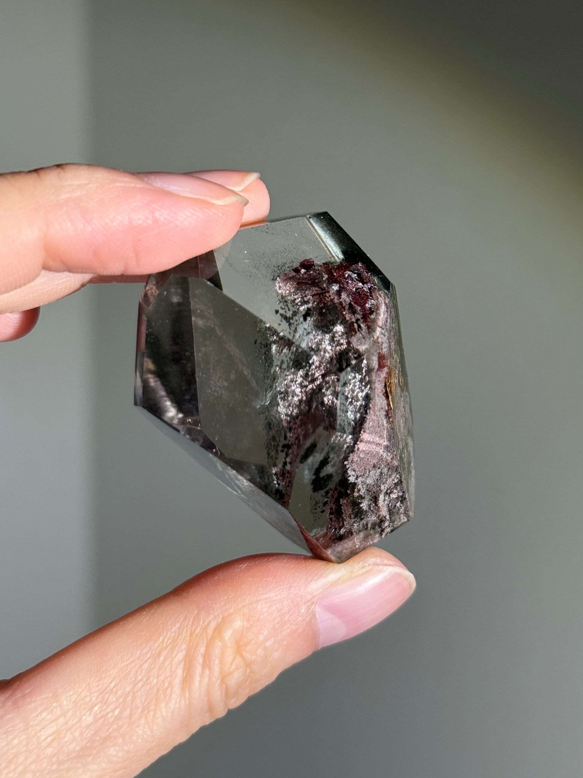 High quality phantom purple and dark green garden (lodalite) quartz freeform. Self standing
