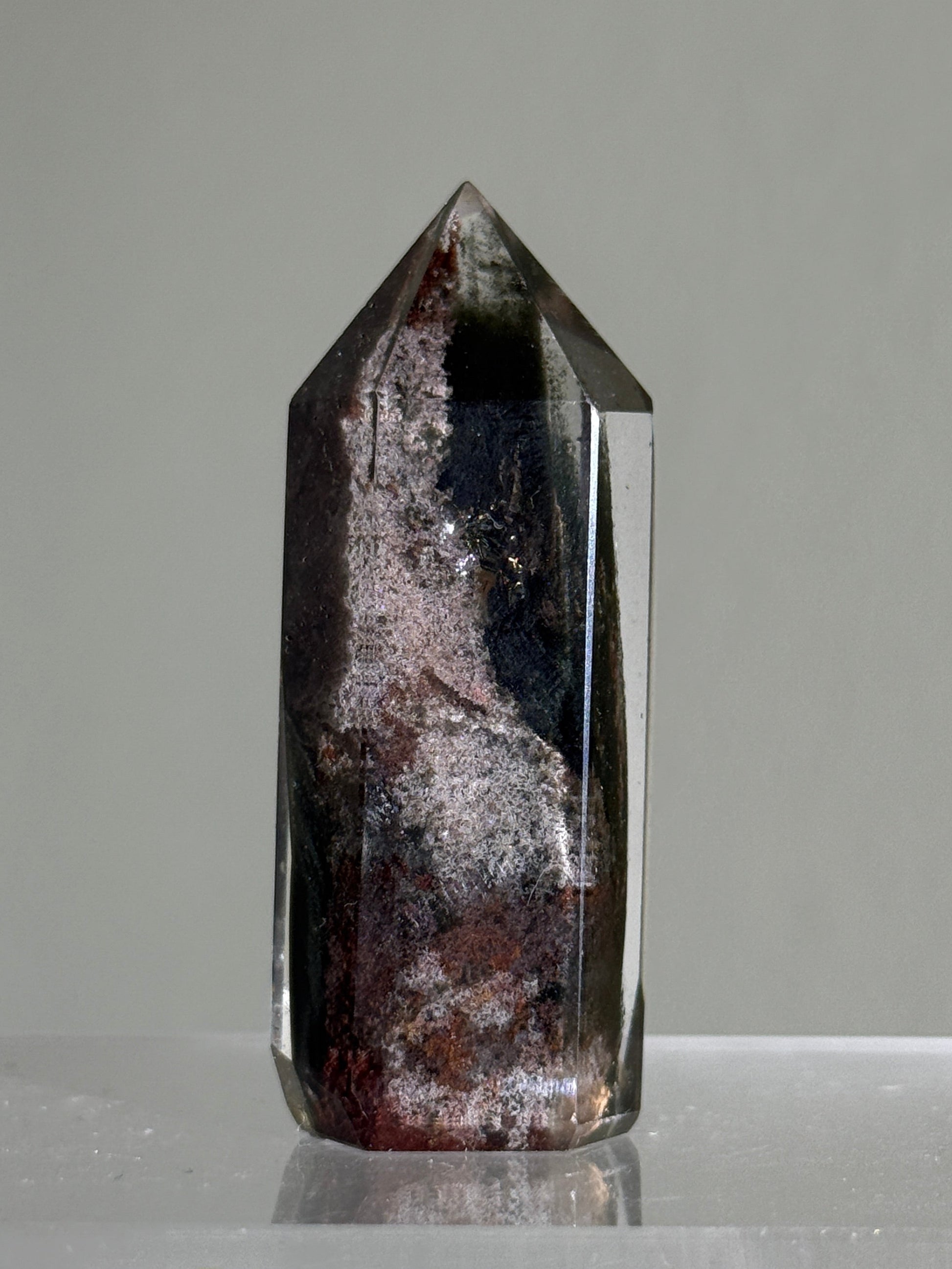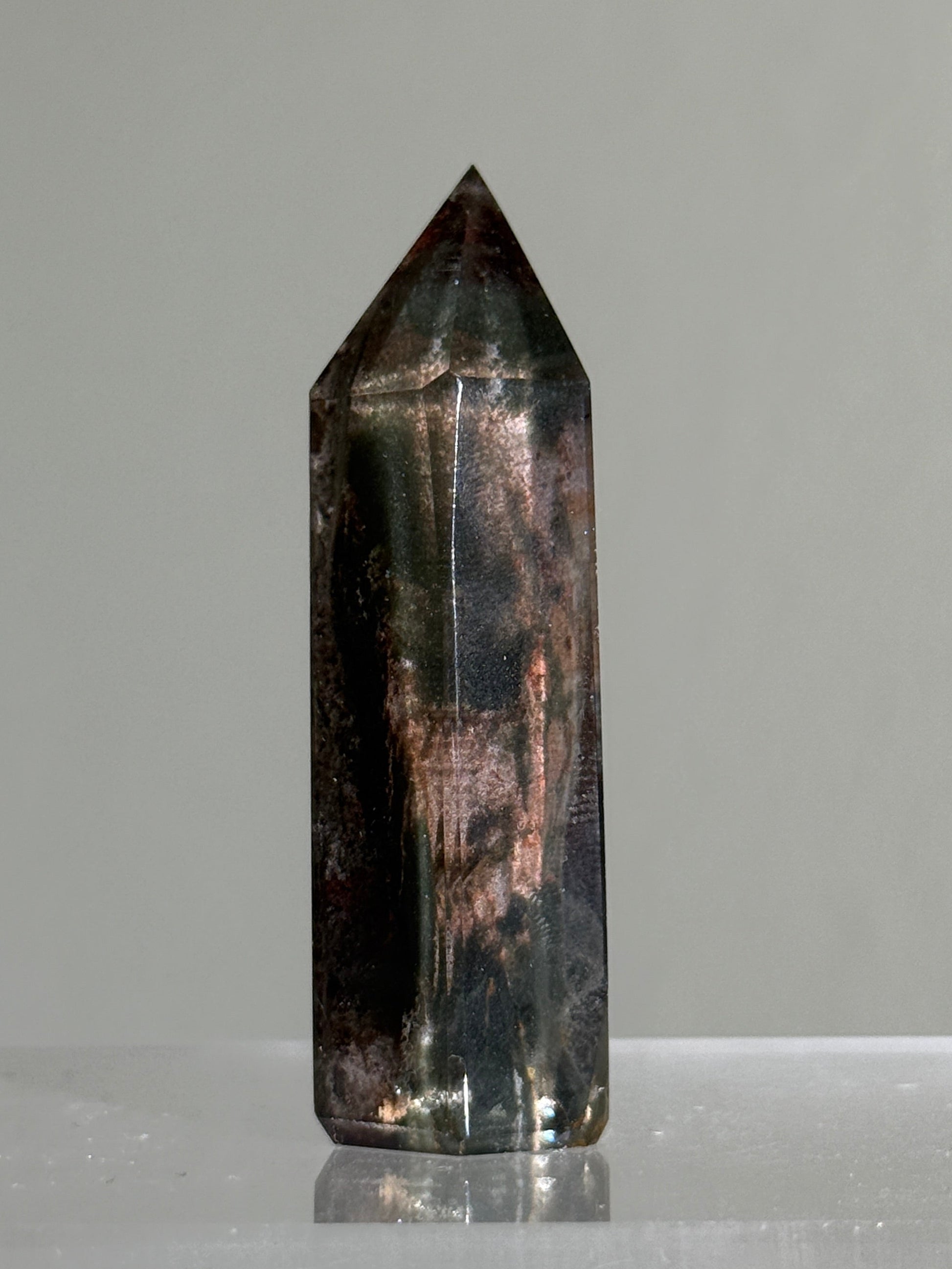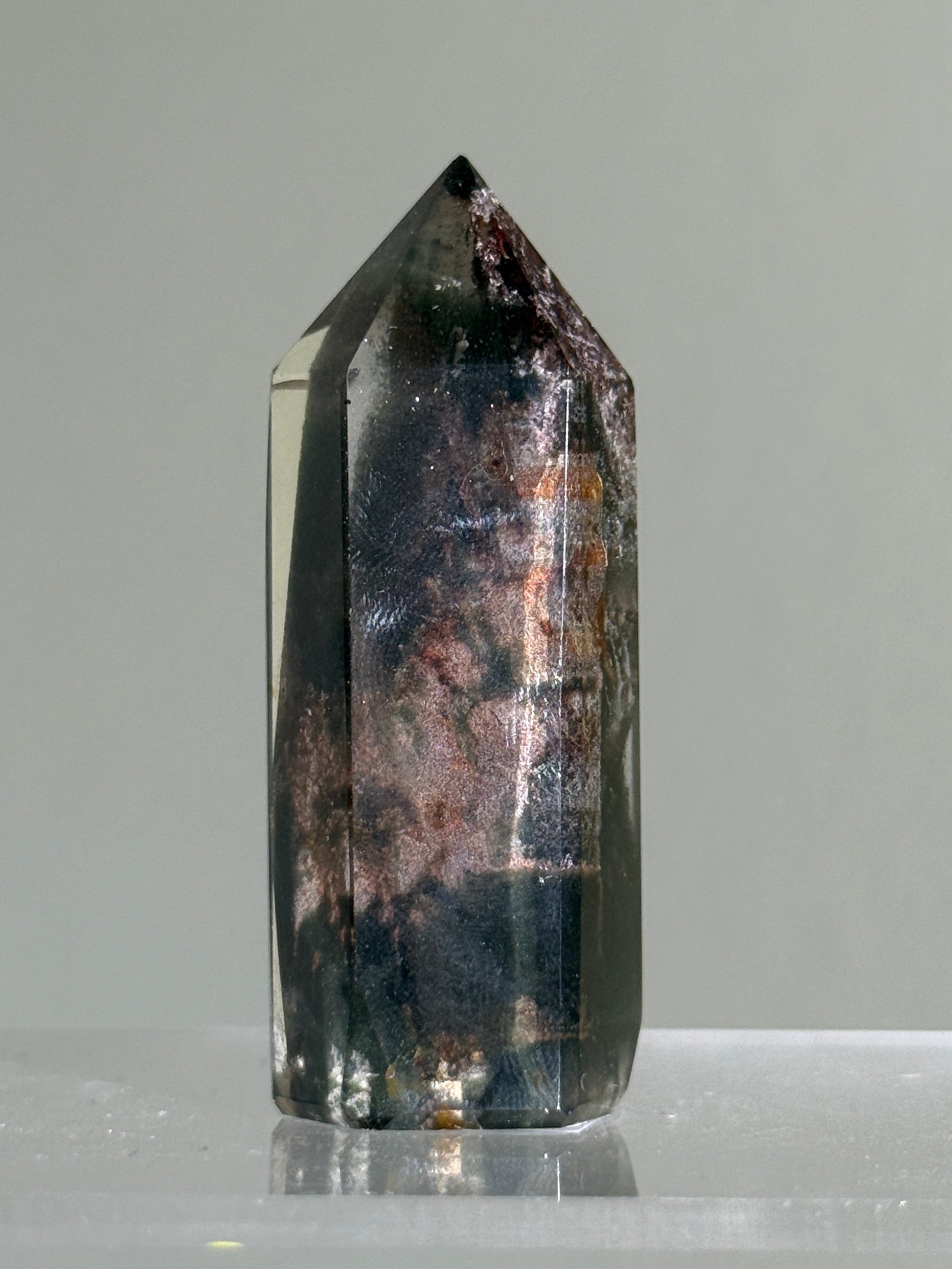 High quality phantom purple and dark green garden (lodalite) quartz tower. Self standing
