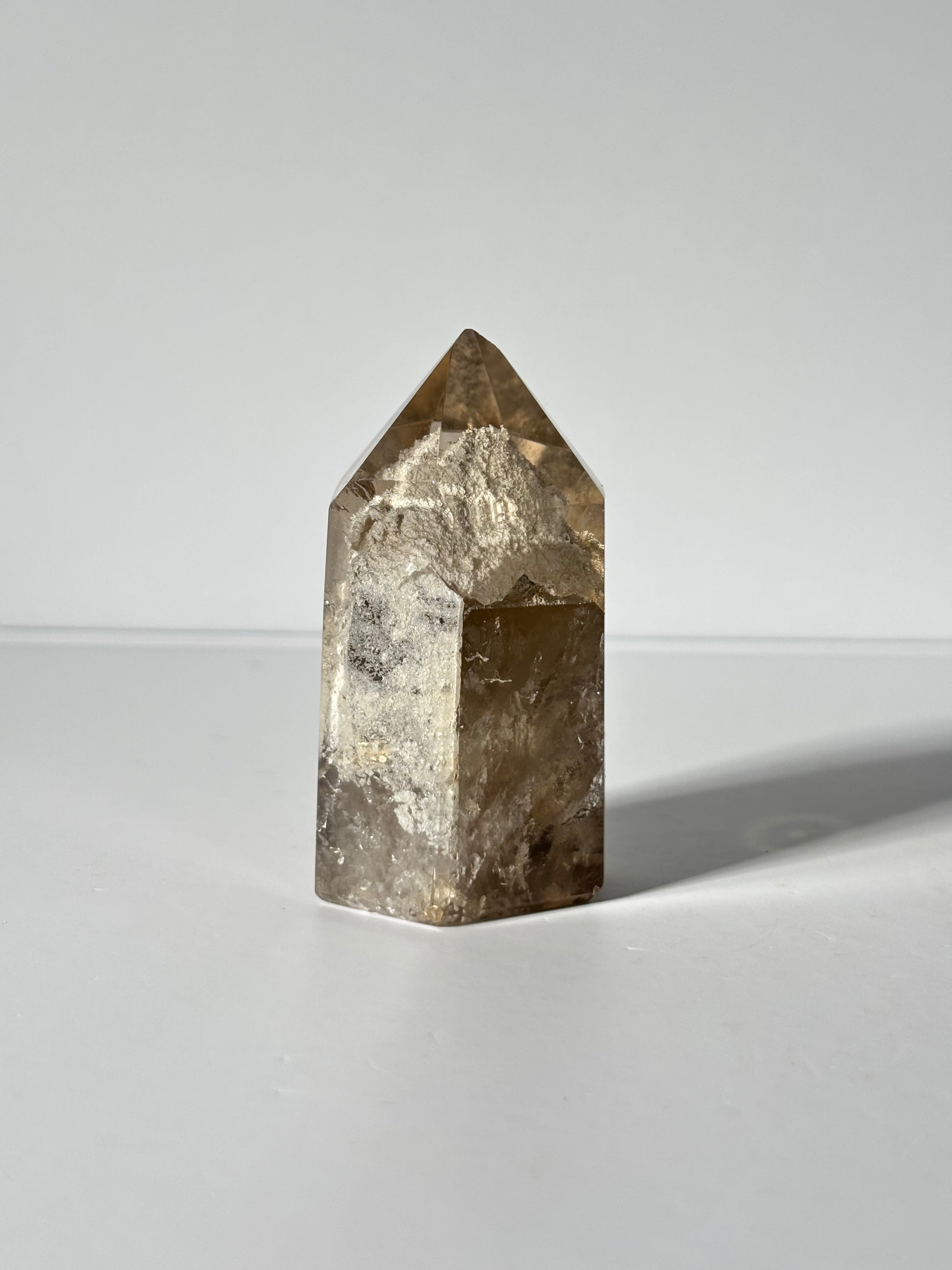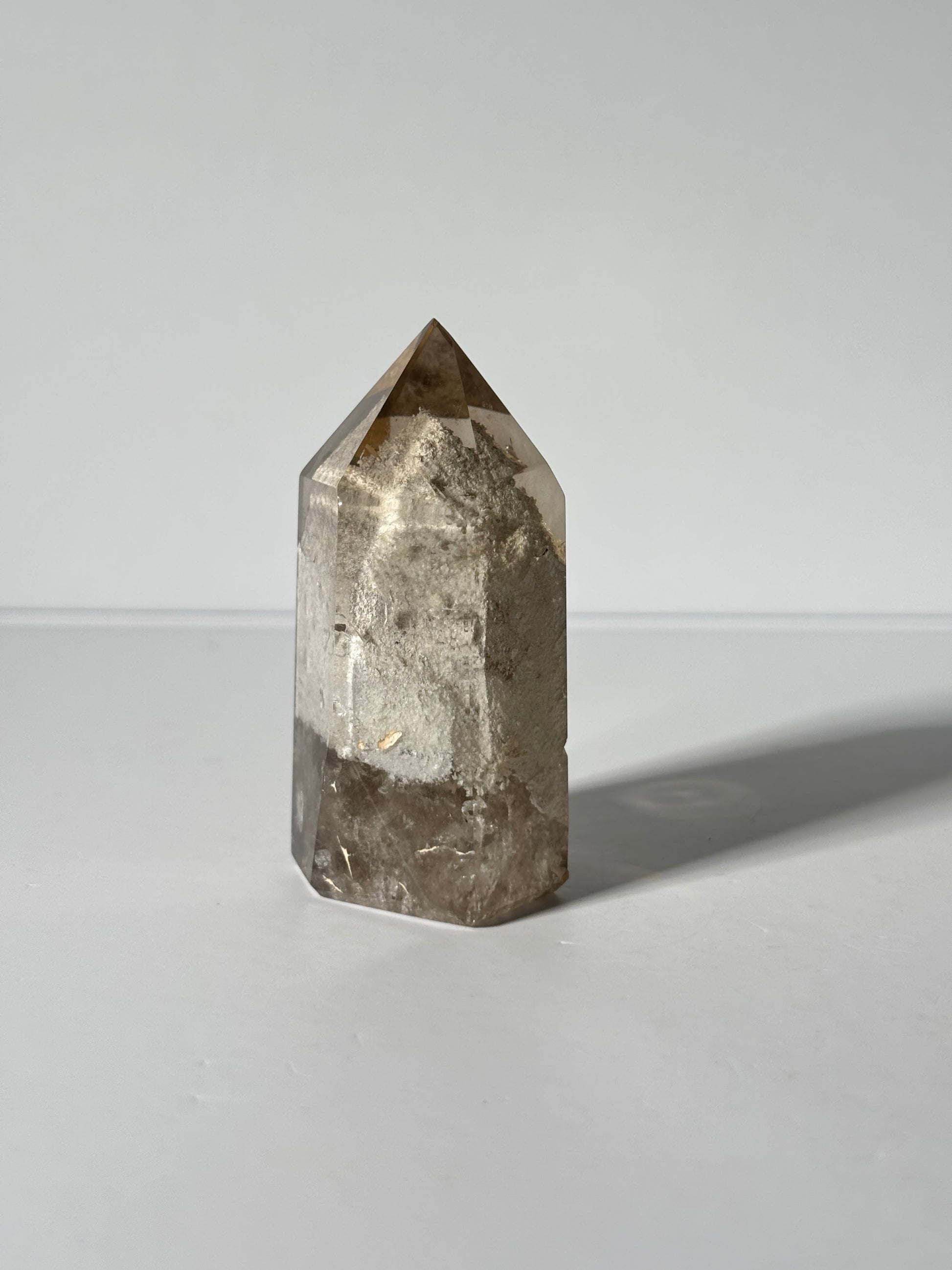 High quality neat three dimensional white phantom lodalite in smoky quartz tower. Self standing.