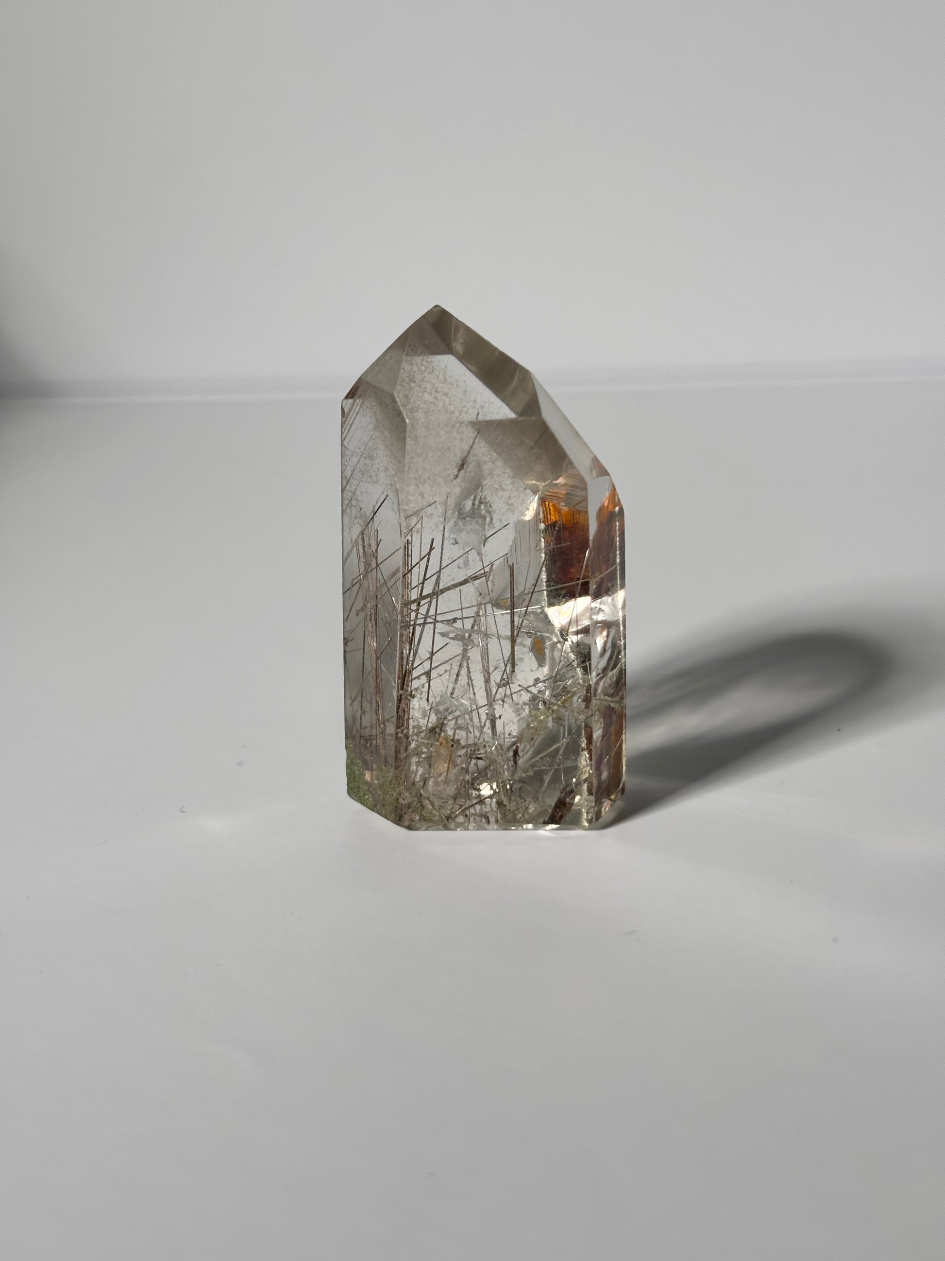 High quality water clear collecto’s grade white phantom chlorite quartz with silver rutile tower. Self standing.