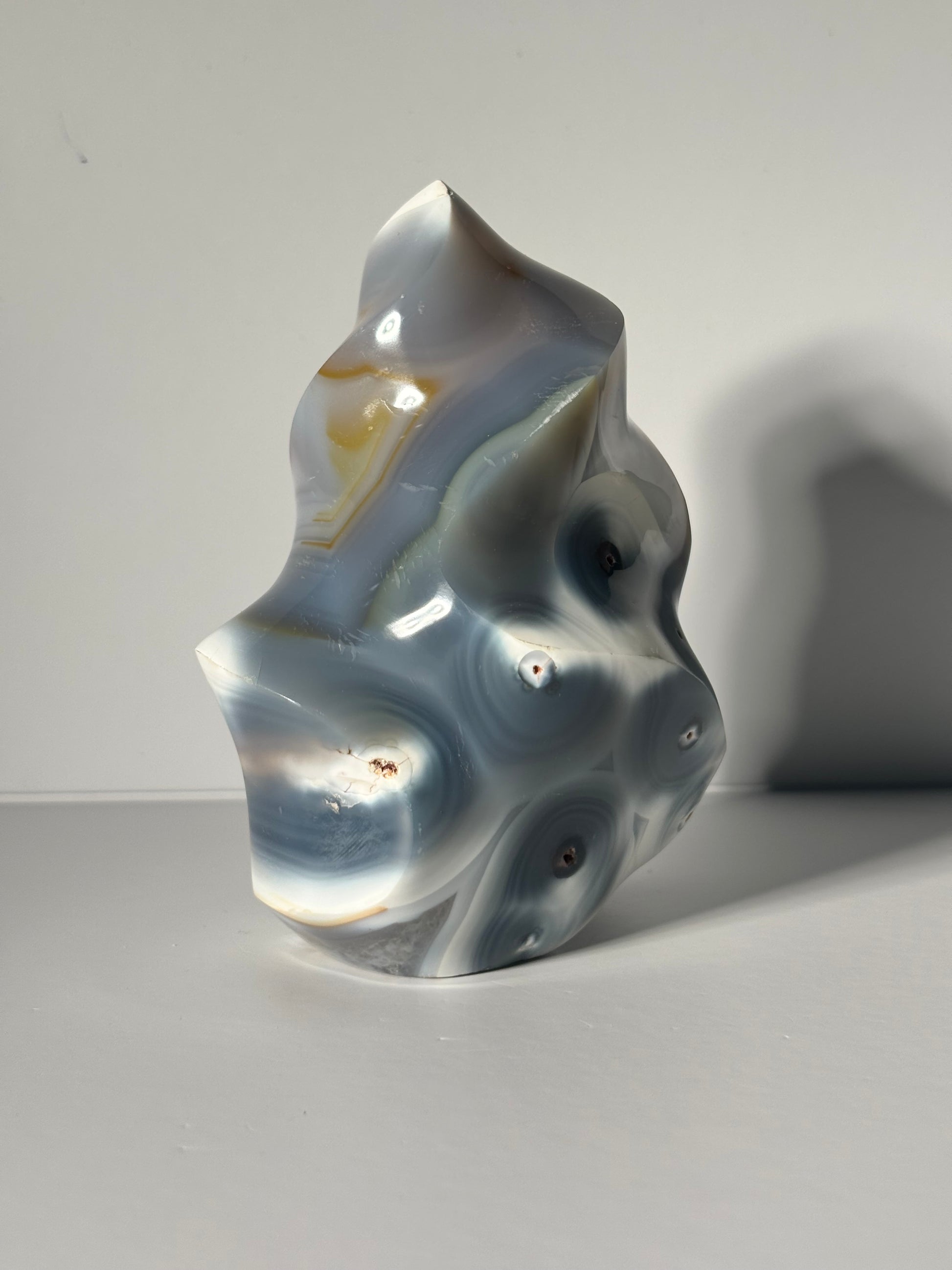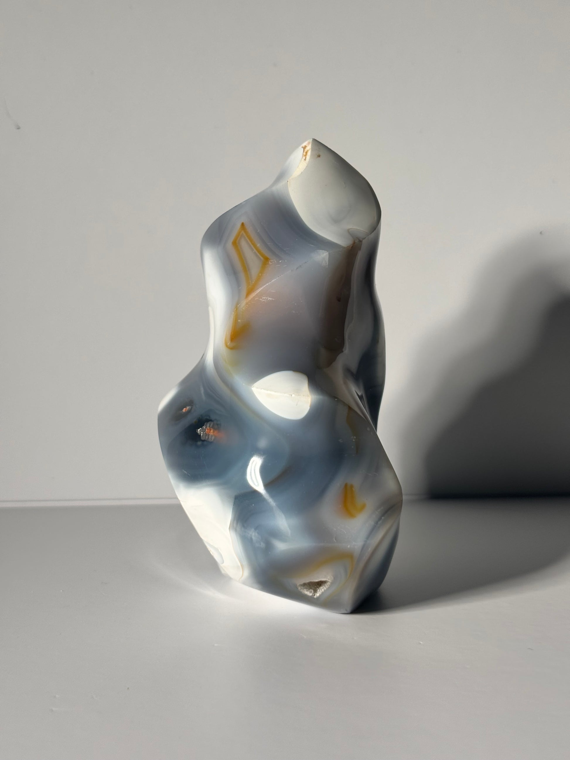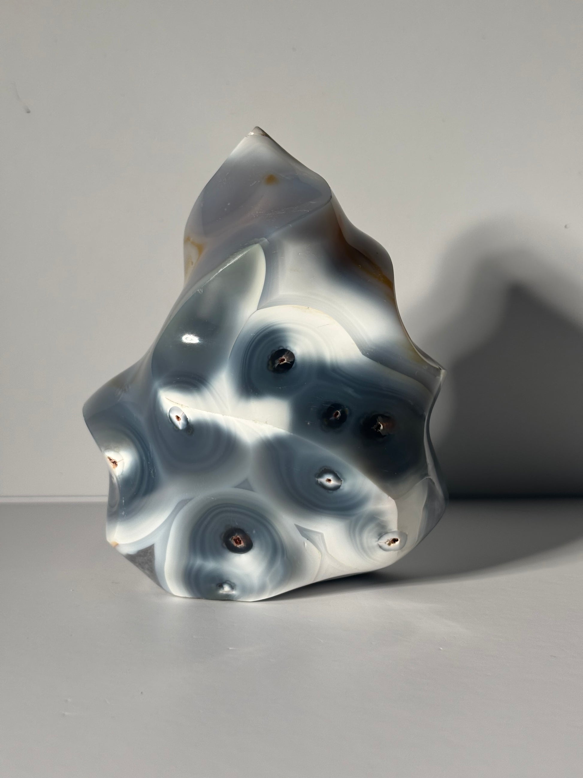 Large gorgeous orca agate flame with bandings. Self standing.