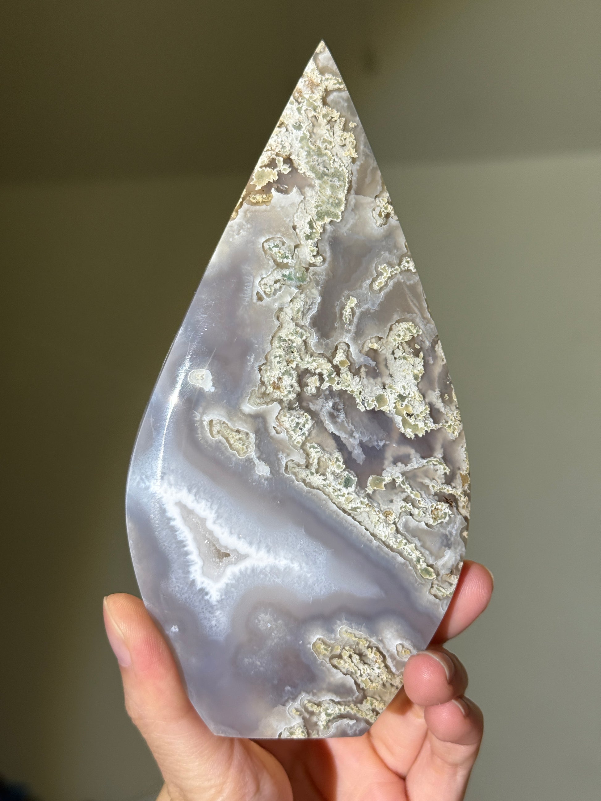 High quality large blue moss agate freeform with gorgeous bandings. Self standing.