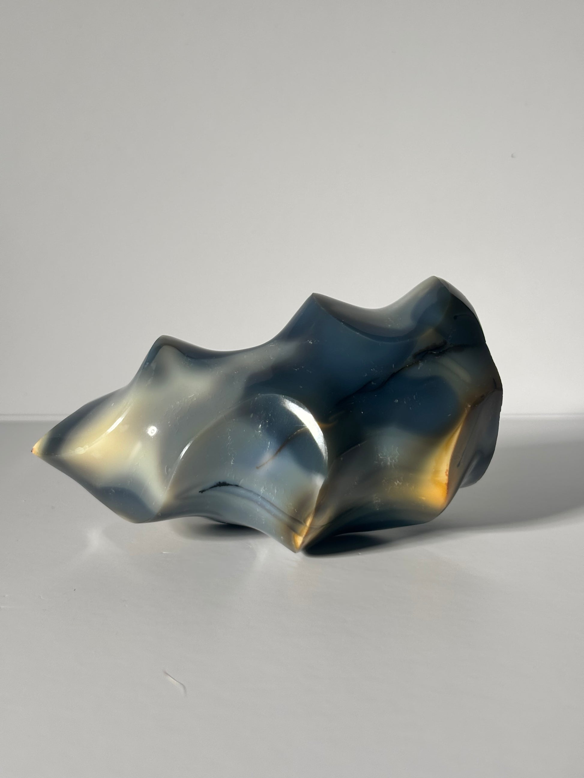 High quality large chunky rare orca agate flame with dendrites. Self standing.
