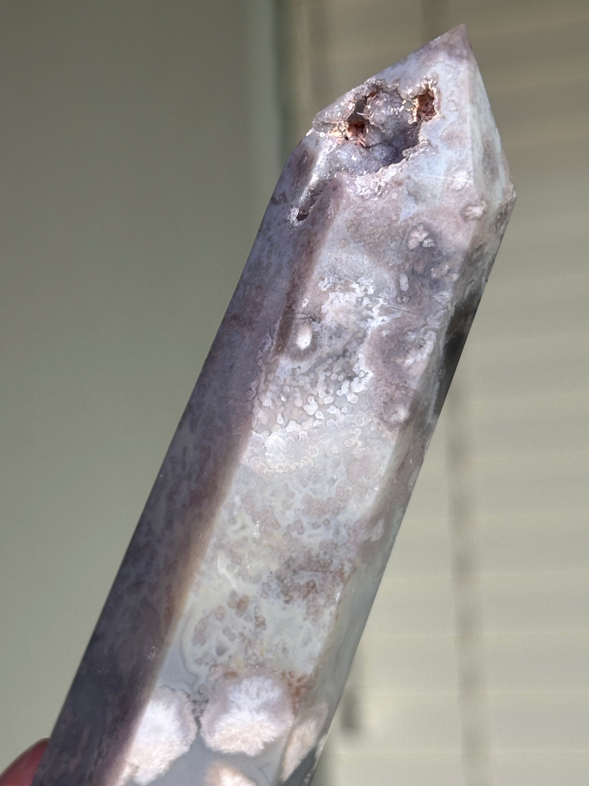 High quality moody druzy grayish blue flower agate tower. Self standing.