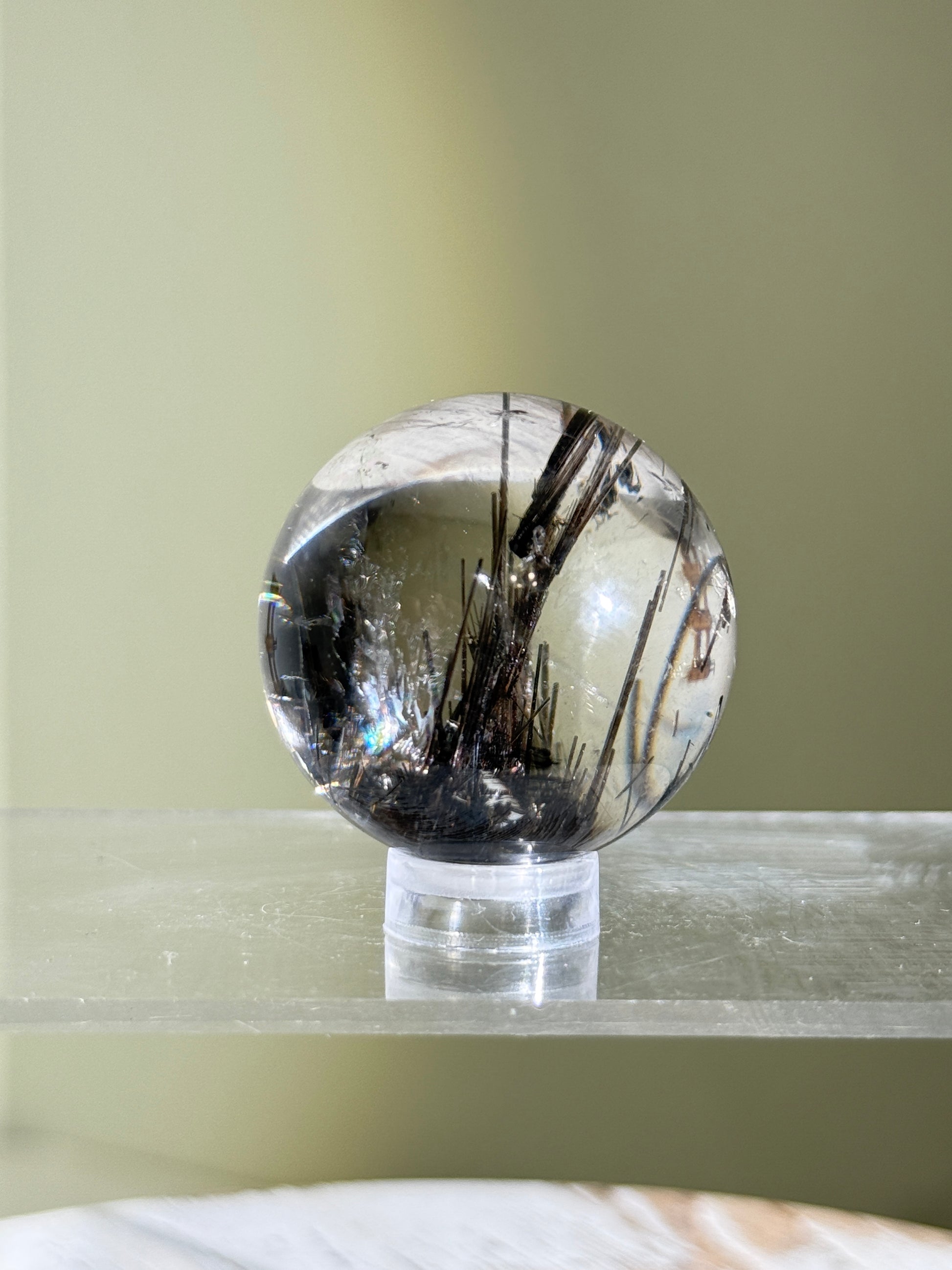High quality water clear collector' grade black tourmaline in quartz sphere.