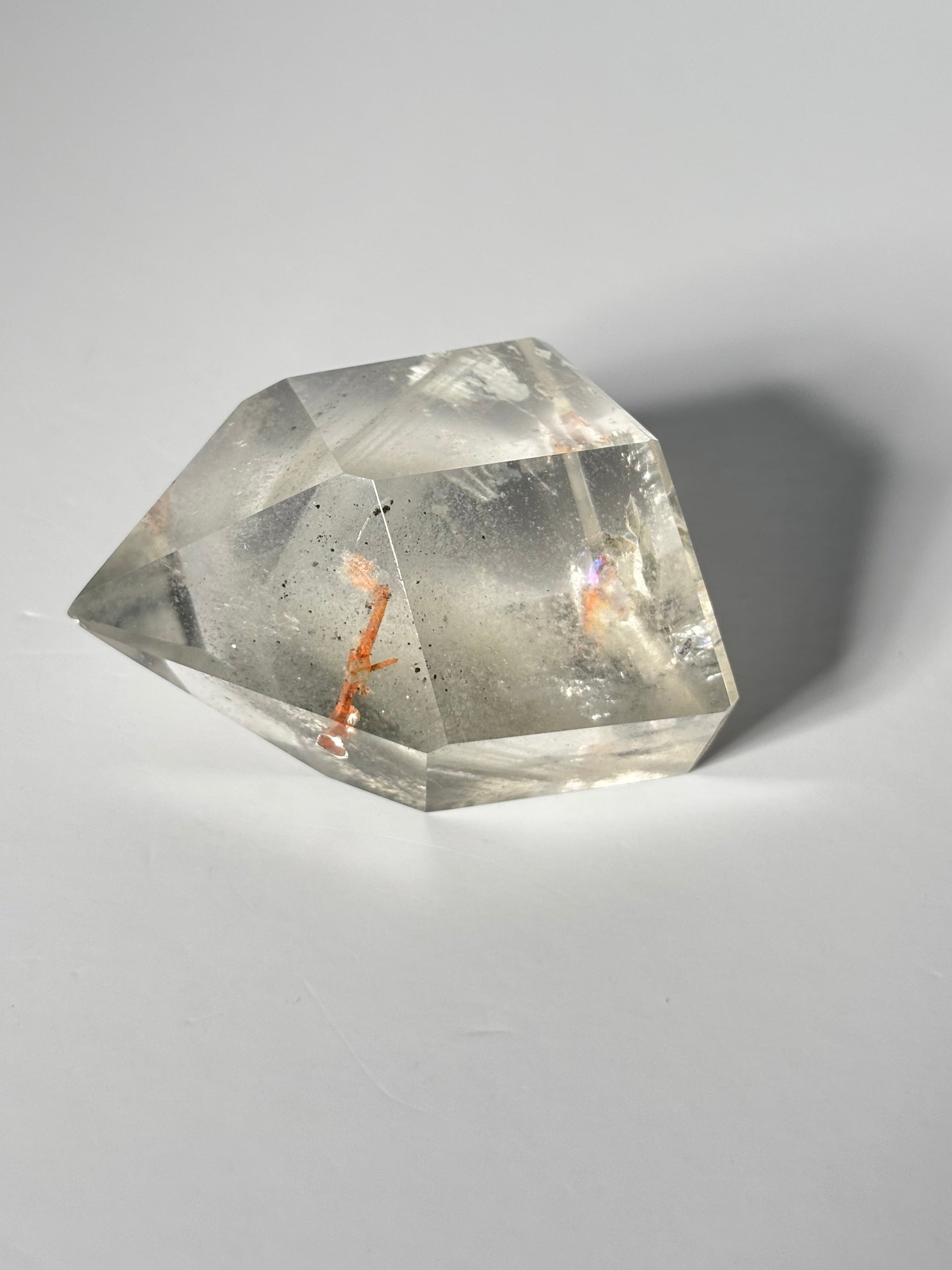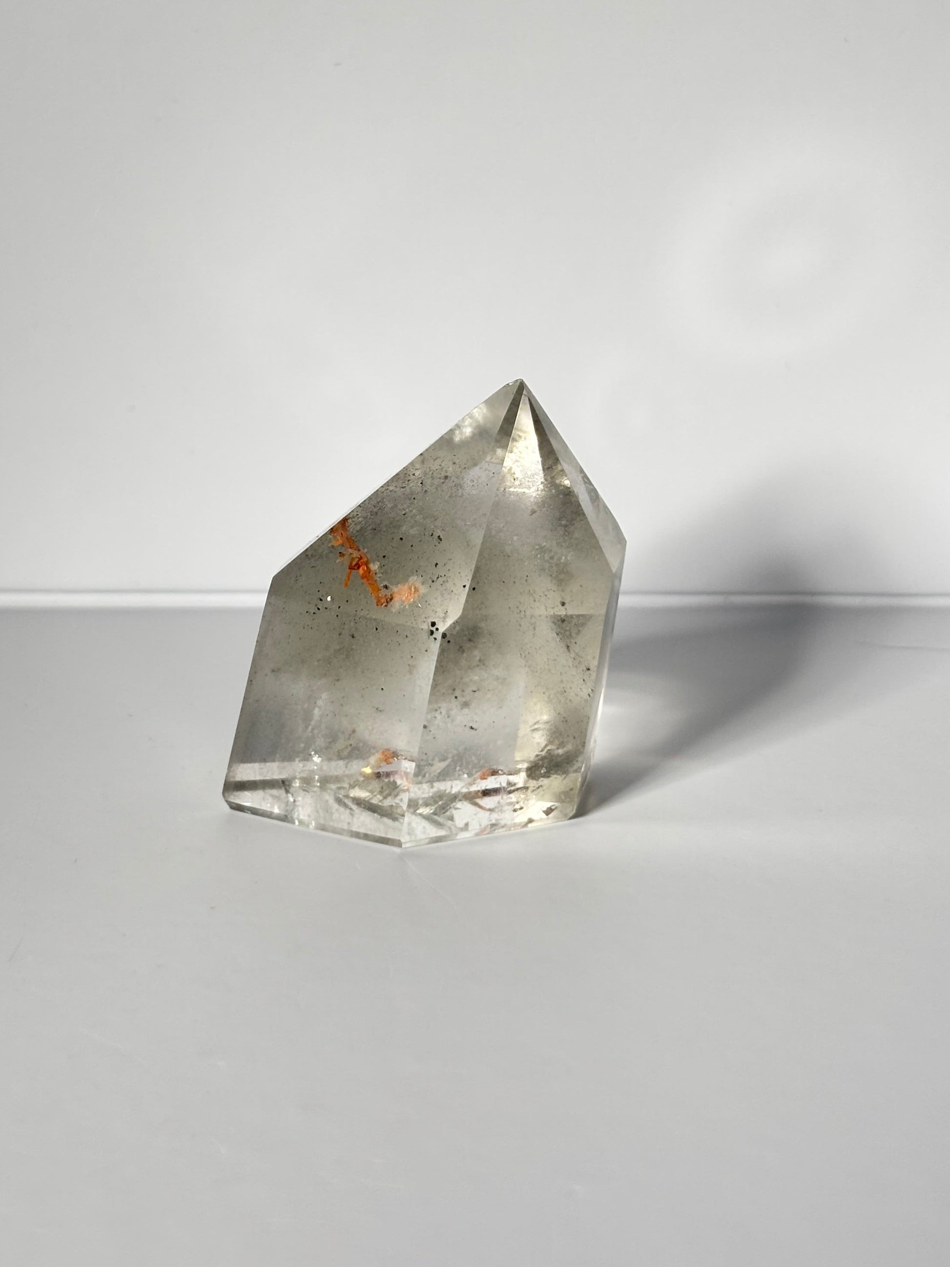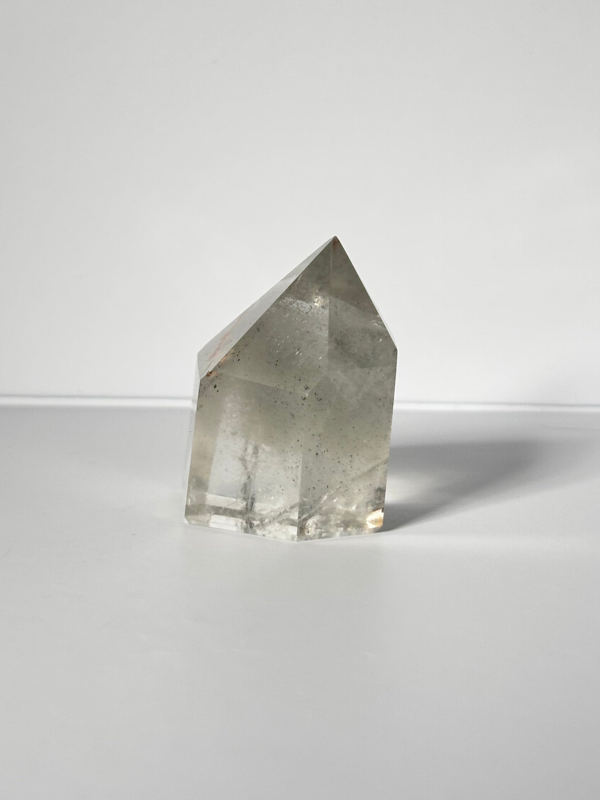 High quality water clear rare grey phantom quartz tower with penetrator. Self standing.