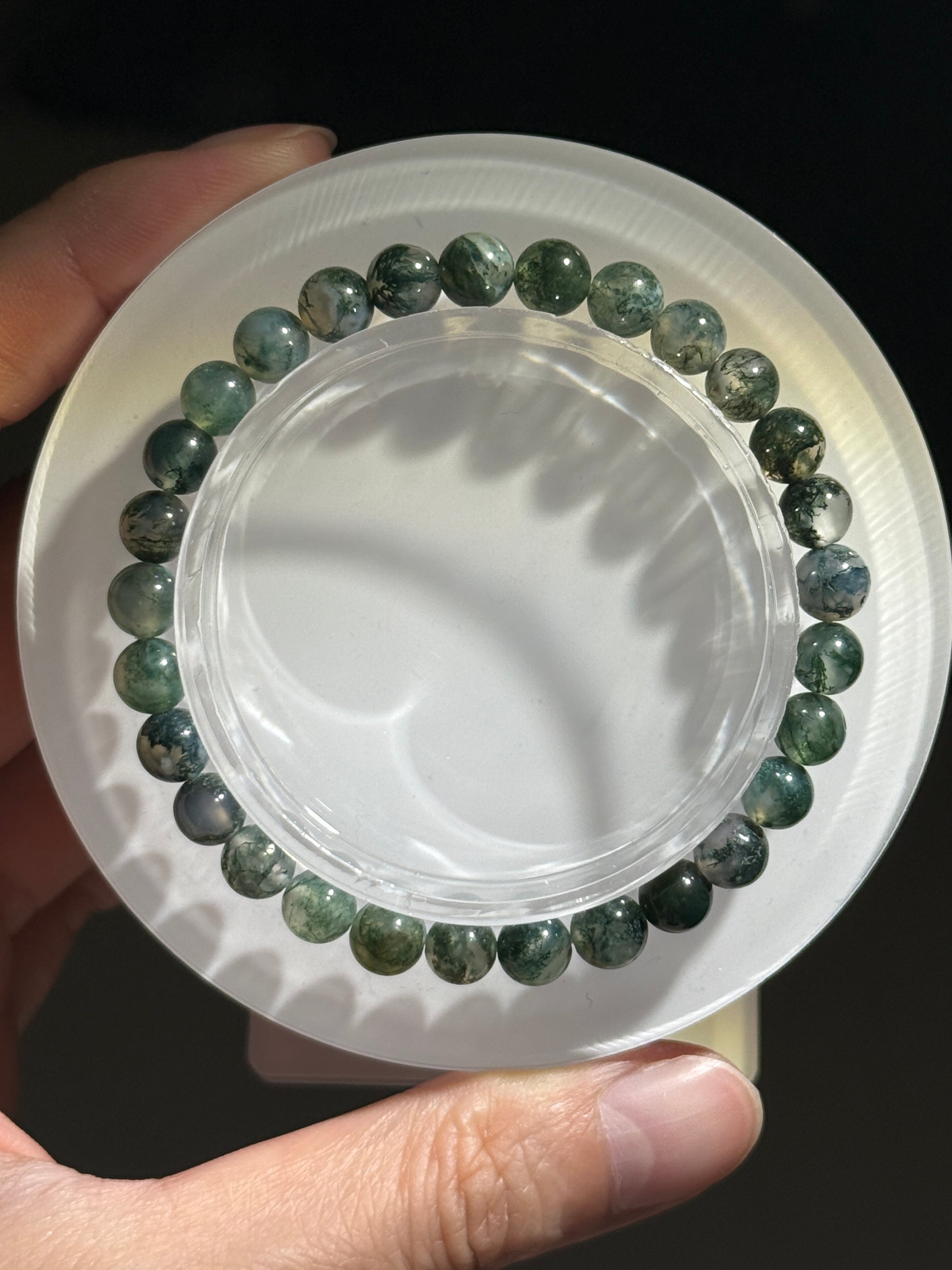 Our moss agate bracelets were carefully handpicked from our vendor. Each bracelet is created with care and hand-strung with elastic string.