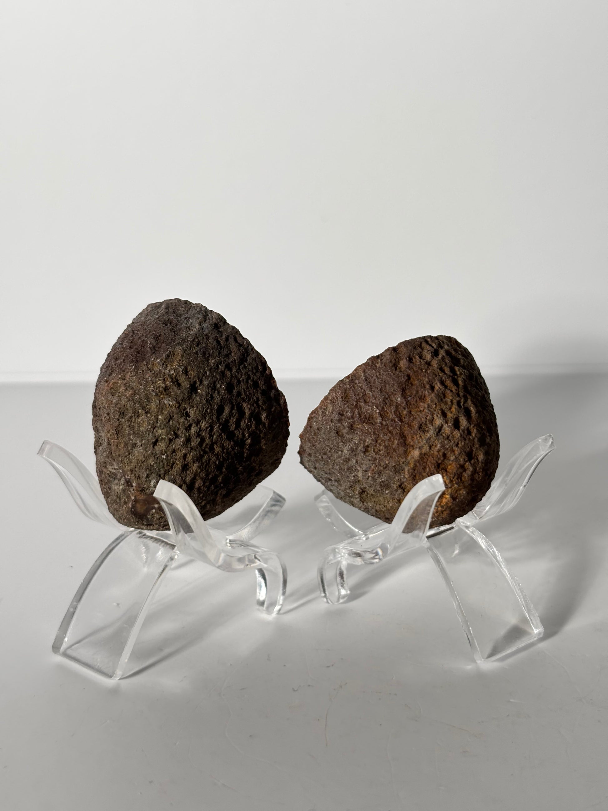 High quality unique druzy orange and pink Zhanguo agate pair. Comes with stands.