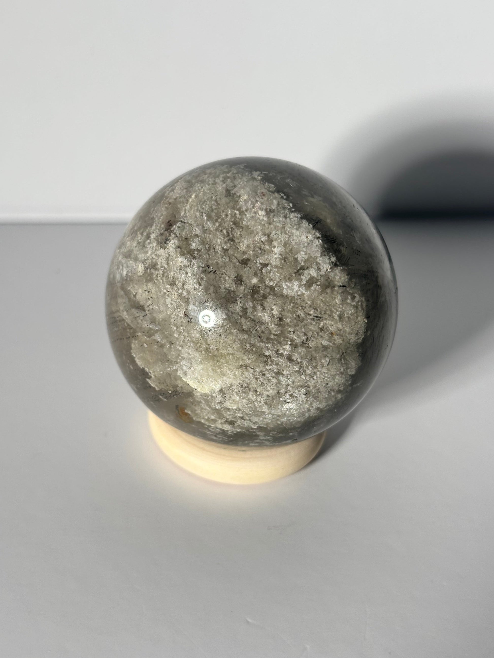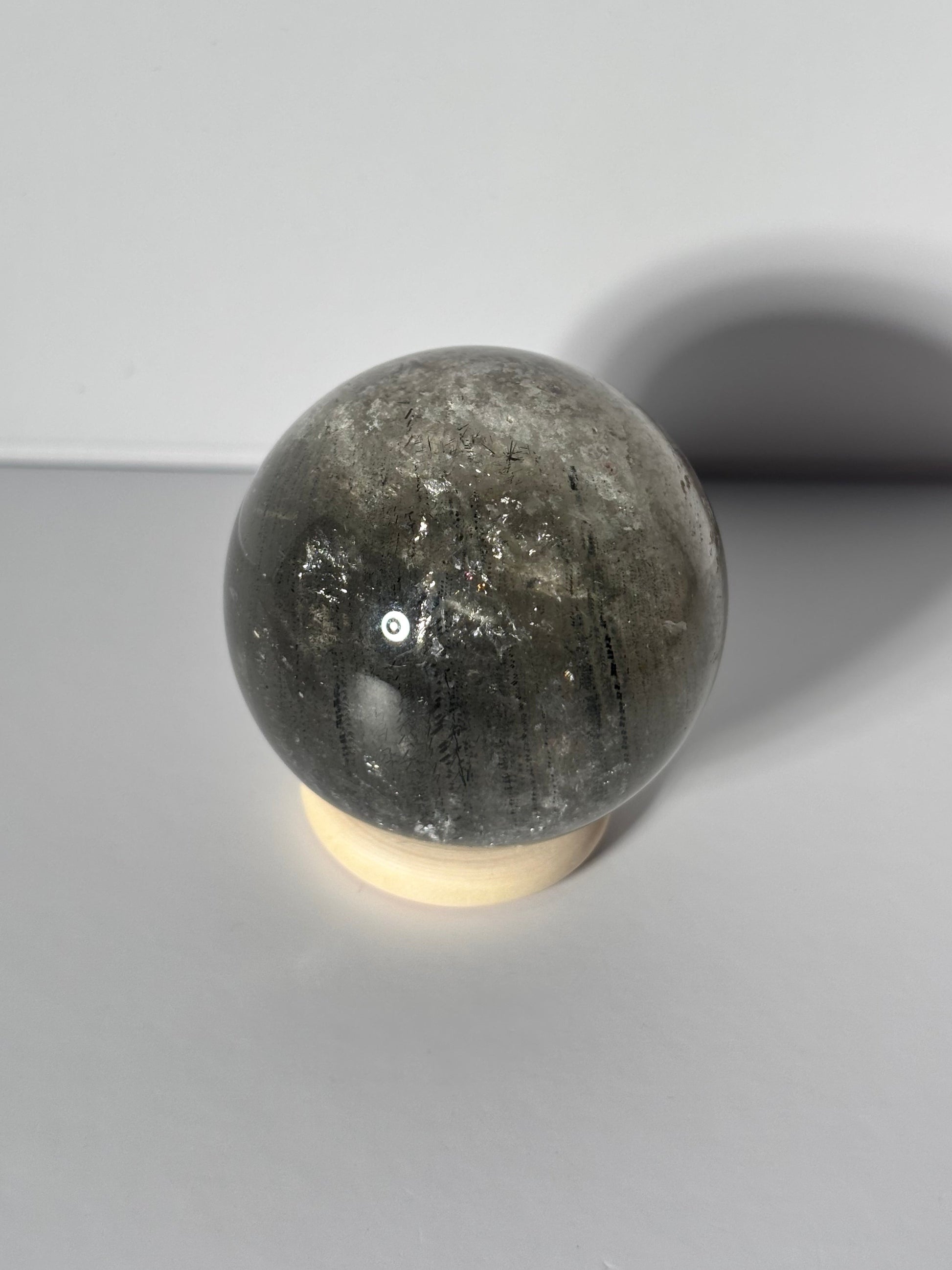 Unique spooky white layered lodalite with black rutile sphere with big rainbow.