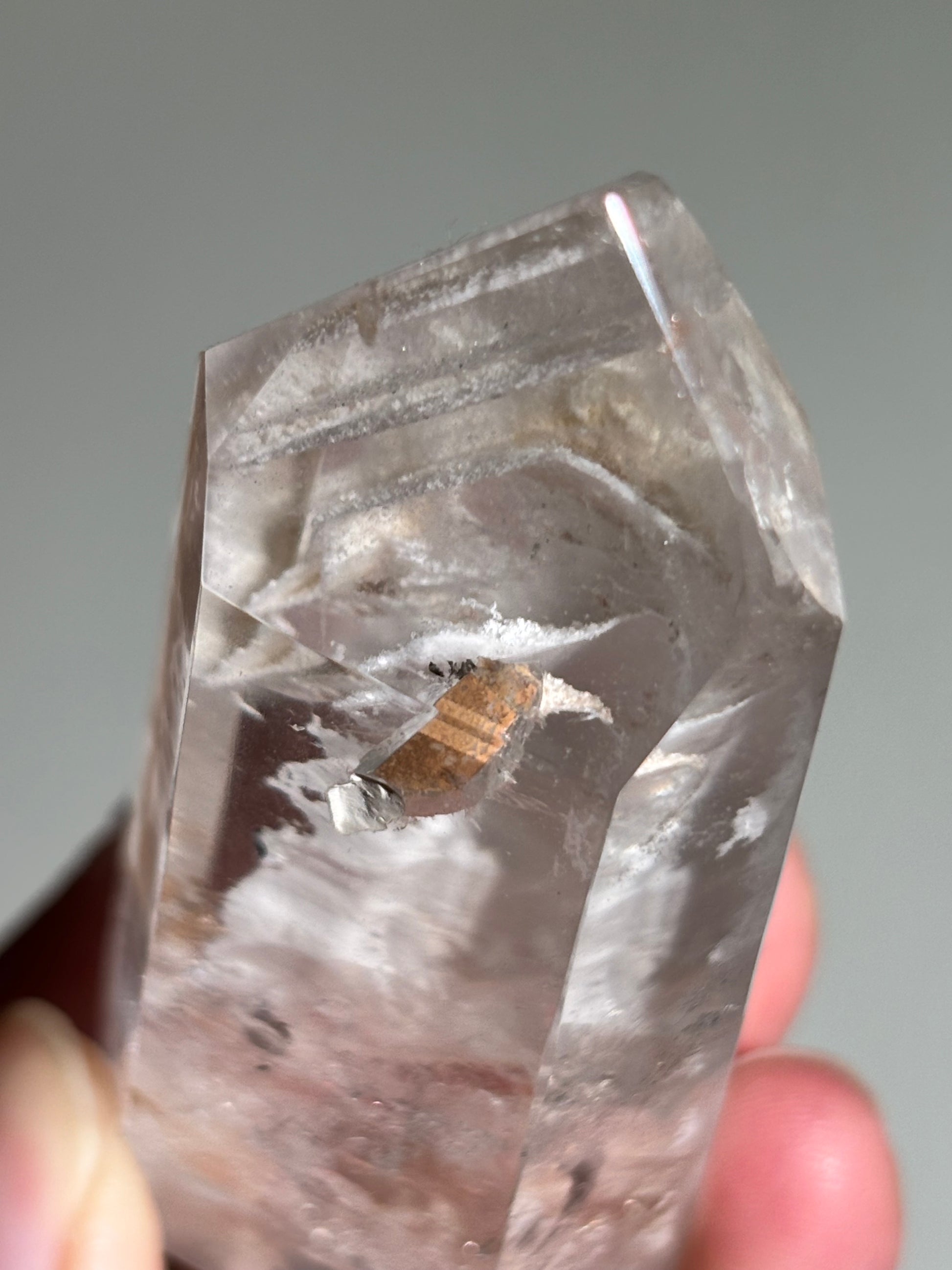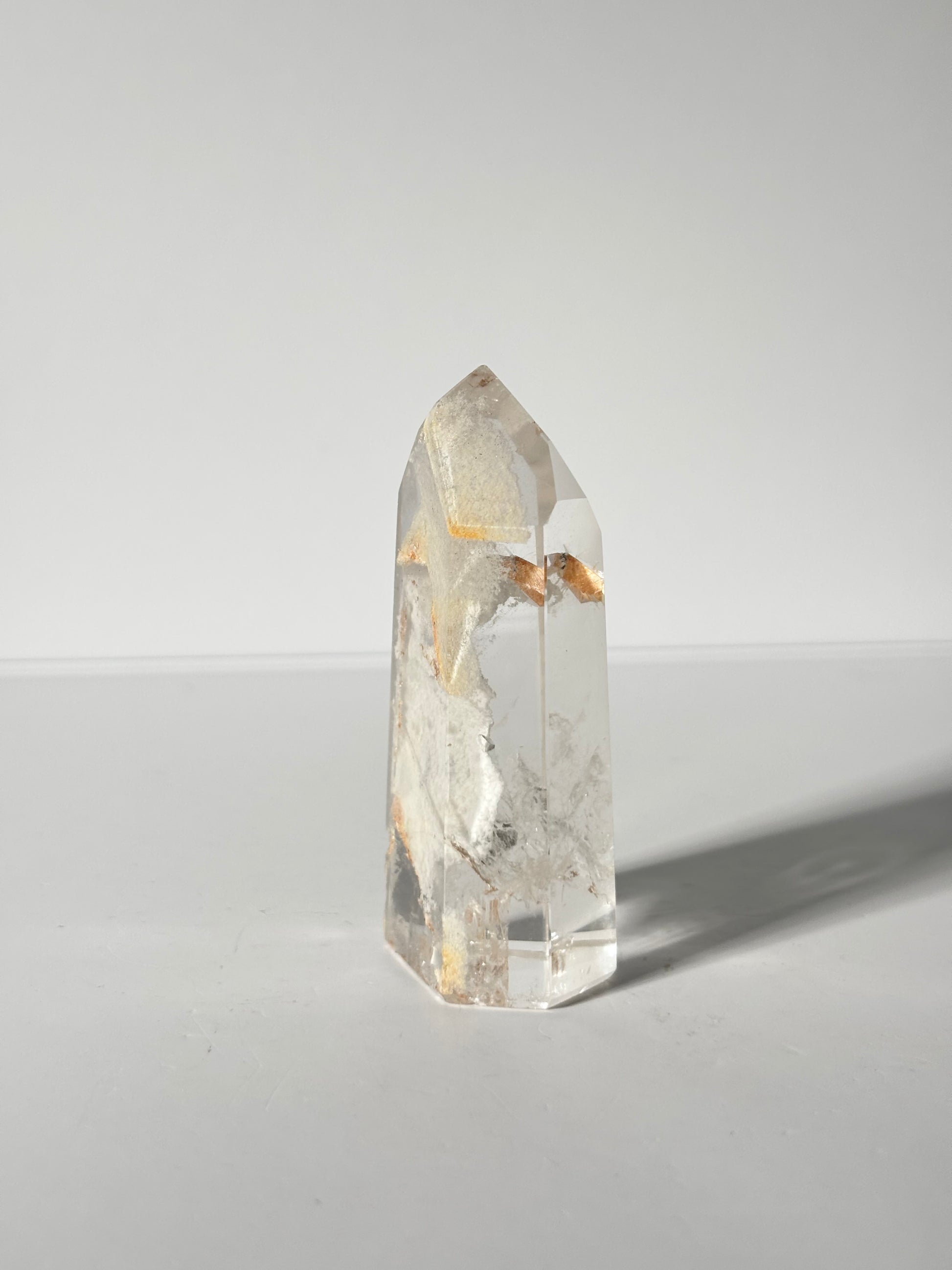 High quality water clear rare white layered phantom lodalite quartz tower with manifestation quartz (crystal in crystal). Self standing.