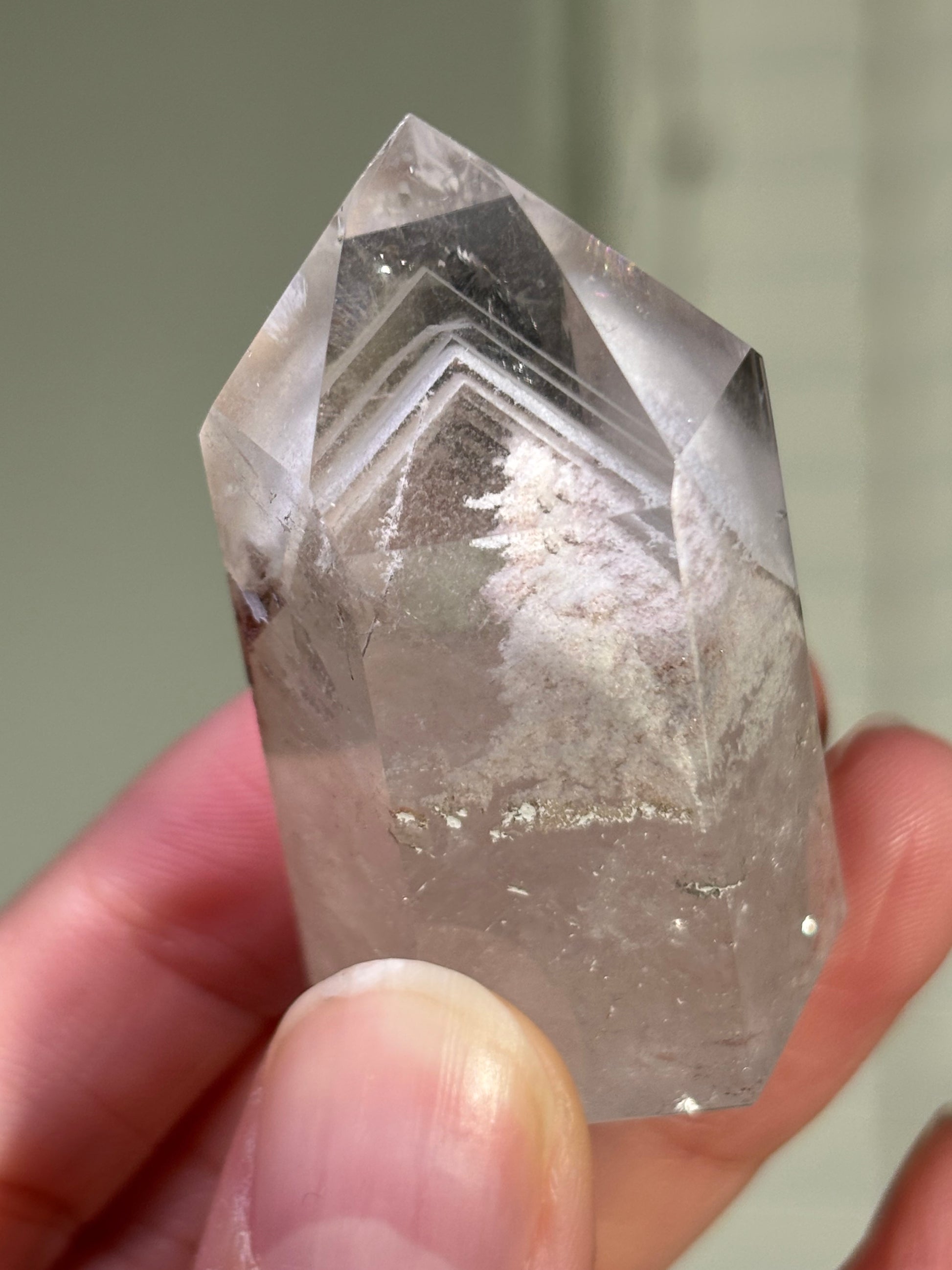 High quality neat white phantom lodalite and chlorite quartz tower. Self standing.